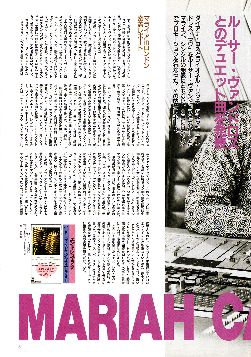 こうして幕を閉した「エンドレス・ラヴ」漬けのロンドン取材。そこで感したのは、大先輩であるルーサー・ヴァンドロスと互角に渡り合うマライアの実力、そしてプロ意識であった。同時に、スーパースターのオチャメな素顔をかいま見て、得した気も・・・・・・。あとは来日公演の実現を願うだけ、かな。