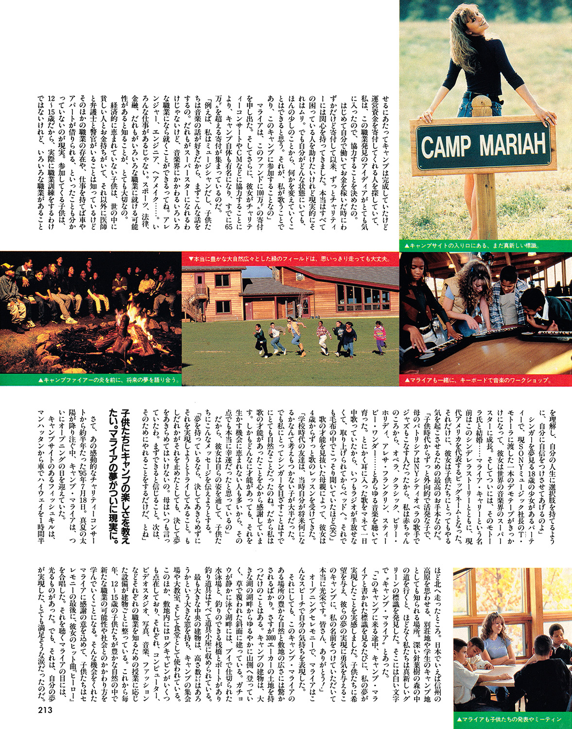 最も大きな中央の建物は、高さ数ir1はあろうかという大きな窓を持ち、キャンプの集会場や大教室、そして食堂として使われている。このほか、敷地内にはログキャビンがいくつも点在しており、それぞれ、コンピューター、ビデオスタジオ、写真、音楽、ファッションなどそれぞれの職業を知るための授業に応じた設備が建物ごとに整っている。これから毎年、12~15歳の子供たちが豊かな自然の中で新たな職業の可能性や社会とのかかわり方を学んでいくことになる。そんな機会をくれたマライアに感謝の意を込めて、子供たちはセレモニーの最後に、彼女のヒット曲『ヒーロー』を合唱した。それを聴くマライアの目には、光るものがあった。でも、それは、自分の夢が実現した、とても満足そうな沢だったのだ。