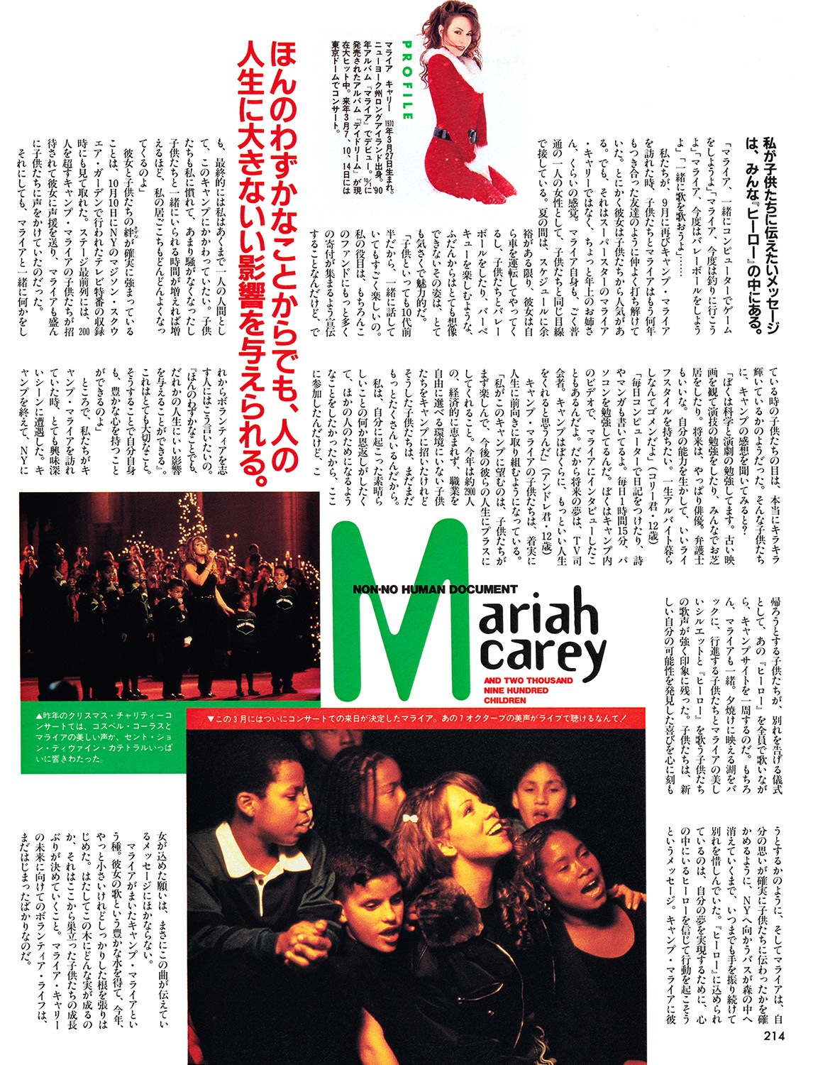 「私たちの基金のために、マライア・キャリーさんから多額の寄付をいただいたことを、まずご報告いたします。私たちの活動の趣旨に賛同していただいたマライアさんは、今日のコンサートをはじめ、私たちの基金の募金活動をこれからも支援してくださいます。そこで私たちは、94年夏から開始した、キャリア・アウェアネス (職業発見)・キャンプのプログラムに、キャンプ・マライアの名前を冠することを、決定いたしました」