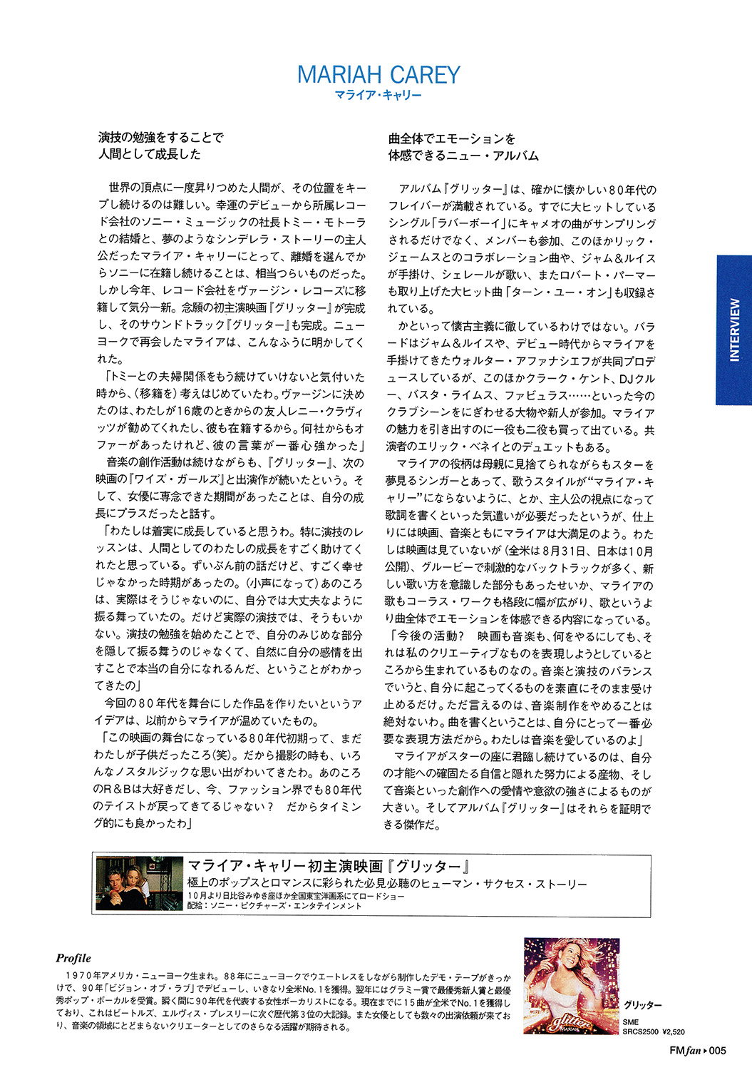 世界の頂点に一度昇りつめた人間が、その位置をキープし続けるのは難しい。幸運のデビューから所属レコード会社のソニー・ミュージックの社長トミー・モトーラとの結婚と、夢のようなシンデレラ・ストーリーの主人公だったマライア・キャリーにとって、離婚を選んでからソニーに在籍し続けることは、相当つらいものだった。しかし今年、レコード会社をヴァージン・レコーズに移籍して気分一新。念願の初主演映画『グリッター』が完成し、そのサウンドトラック『グリッター』も完成。ニューヨークで再会したマライアは、こんなふうに明かしてくれた。