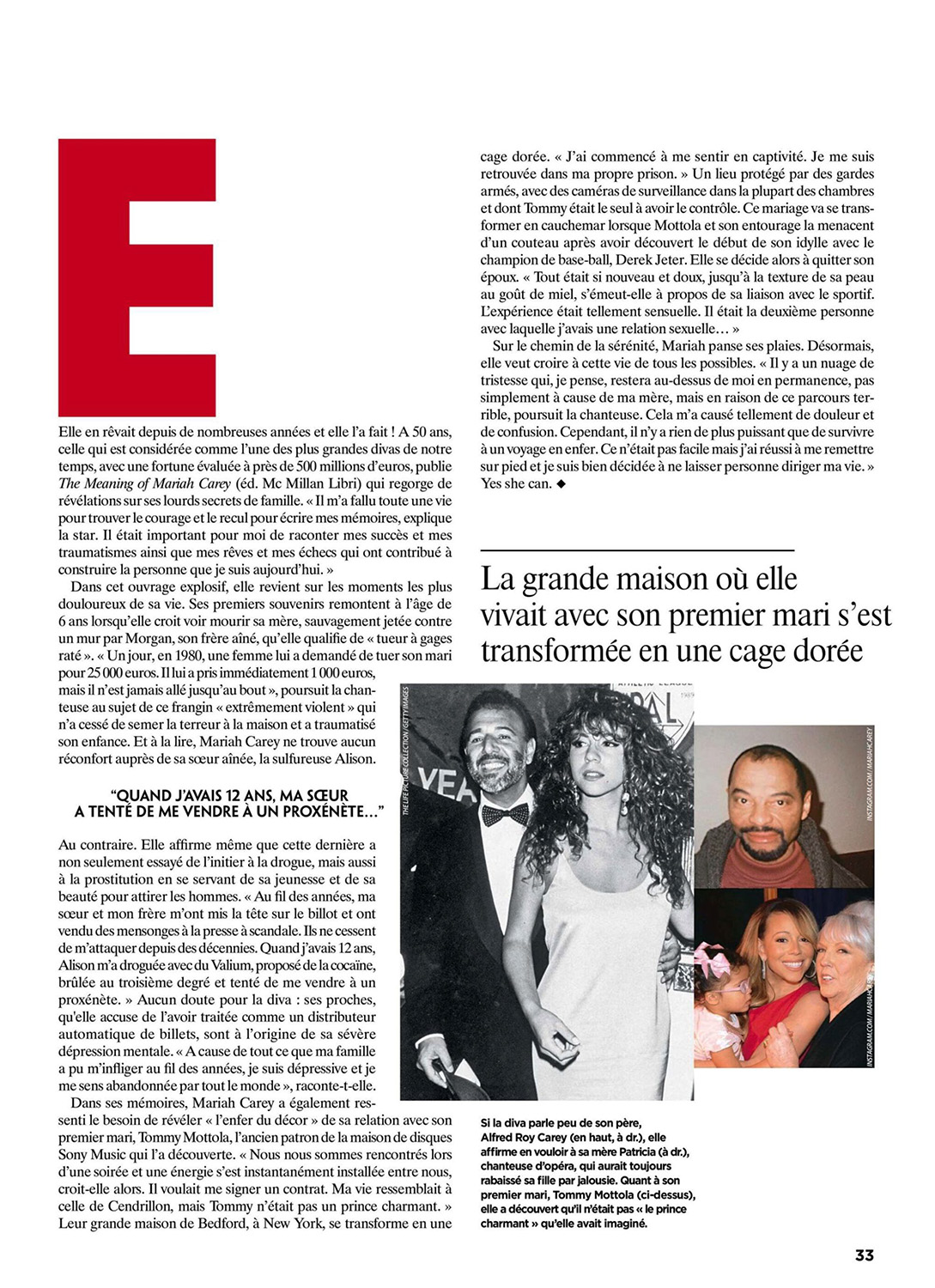 Dans ses mémoires, Mariah Carey a également ressenti le besoin de révéler “l'enfer du décor” de sa relation avec son premier mari, Tommy Mottola, l'ancien patron de la maison de disques Sony Music qui l'a découverte. “Nous nous sommes rencontrés lors d'une soirée et une énergie s'est instantanément installée entre nous, croit-elle alors. Il voulait me signer un contrat. Ma vie ressemblait à celle de Cendrillon, mais Tommy n'était pas un prince charmant.” Leur grande maison de Bedford, à New York, se transforme en une cage dorée. “J'ai commencé à me sentir en captivité. Je me suis retrouvée dans ma propre prison.” Un lieu protégé par des gardes armés, avec des caméras de surveillance dans la plupart des chambres et dont Tommy était le seul à avoir le contrôle. Ce mariage va se transformer en cauchemar lorsque Mottola et son entourage la menacent d'un couteau après avoir découvert le début de son idylle avec le champion de base-ball, Derek Jeter. Elle se décide alors à quitter son époux. “Tout était si nouveau et doux, jusqu'à la texture de sa peau au goût de miel, s'émeut-elle à propos de sa liaison avec le sportif. L'expérience était tellement sensuelle. Il était la deuxième personne avec laquelle j'avais une relation sexuelle…”