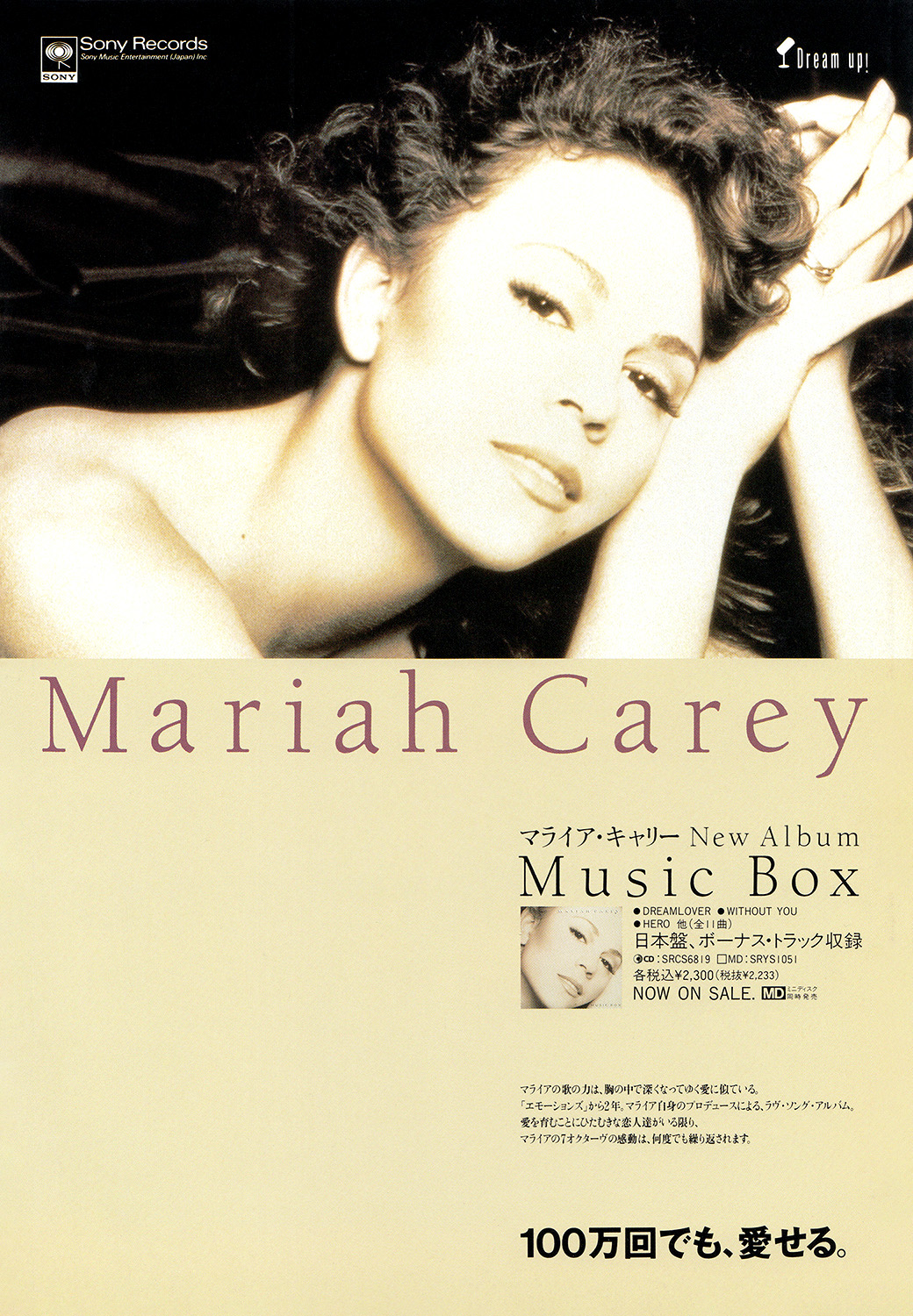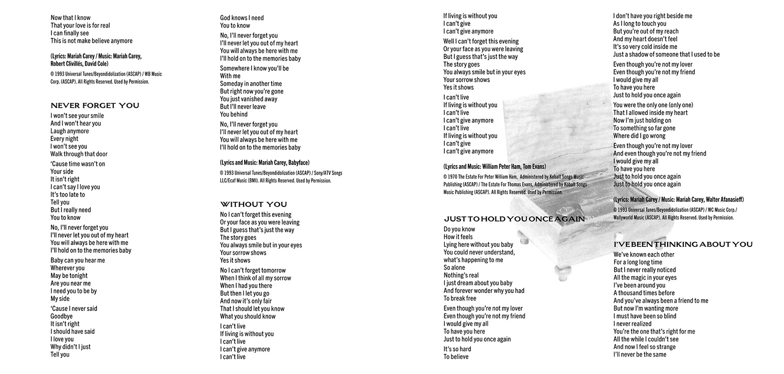 Music Box includes a cover of the song “Without You,” originally recorded by Badfinger in 1970 and made popular by Harry Nilsson in 1971. “I used to love the song when I was a little girl and I remember that it always made me cry and I always thought it was such a beautiful song,” Mariah said. “I heard it again when I was in a restaurant and I was like ‘I love this song, this is such a great song, I haven't heard it in so long’ and I just decided that I wanted to cover it.” In the United States, it was released on January 25, 1994, as a double-sided single with “Never Forget You,” written by Mariah and Kenny “Babyface” Edmonds. The single peaked at number three on the Billboard Hot 100 chart and spent thirteen weeks in the Top 10. “Without You” enjoyed a massive success across Europe, becoming Mariah's first number-one single in the United Kingdom and topping the singles charts in Austria, Belgium, Germany, Iceland, Ireland, the Netherlands, Scotland, Sweden and Switzerland.