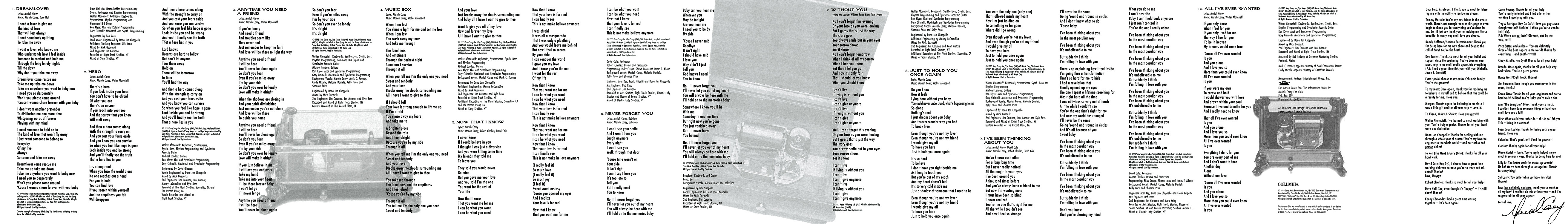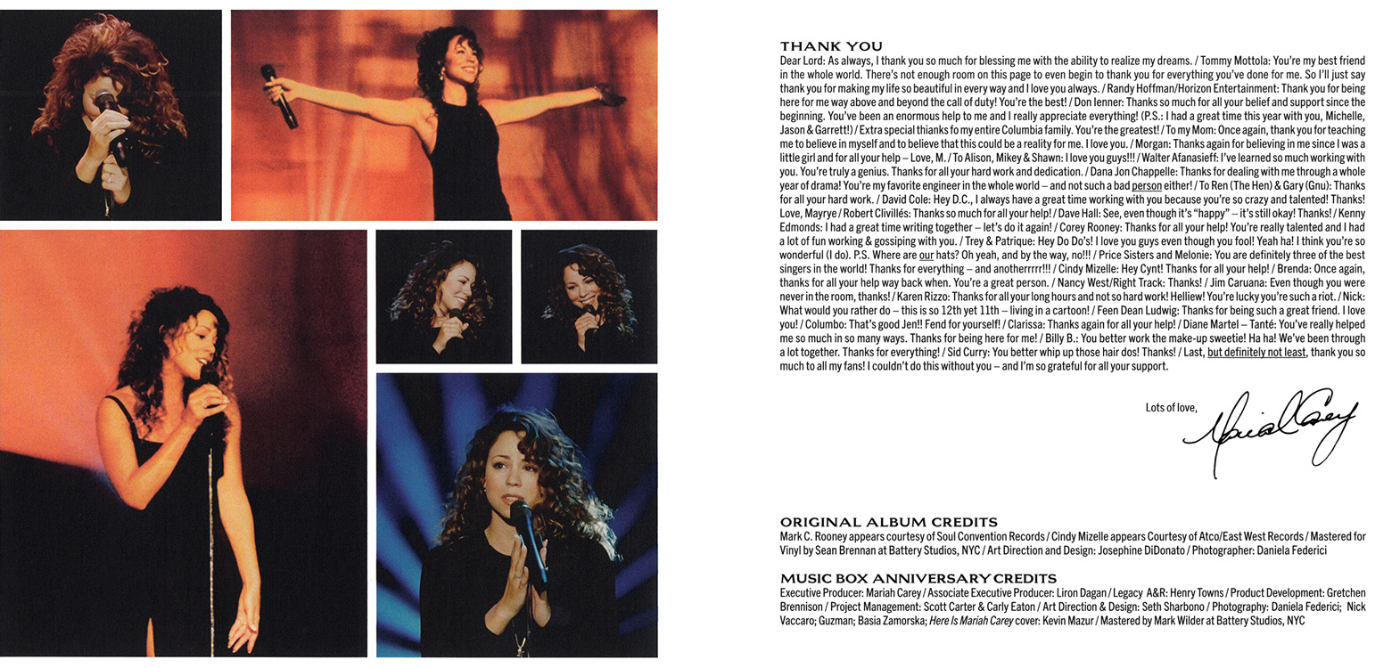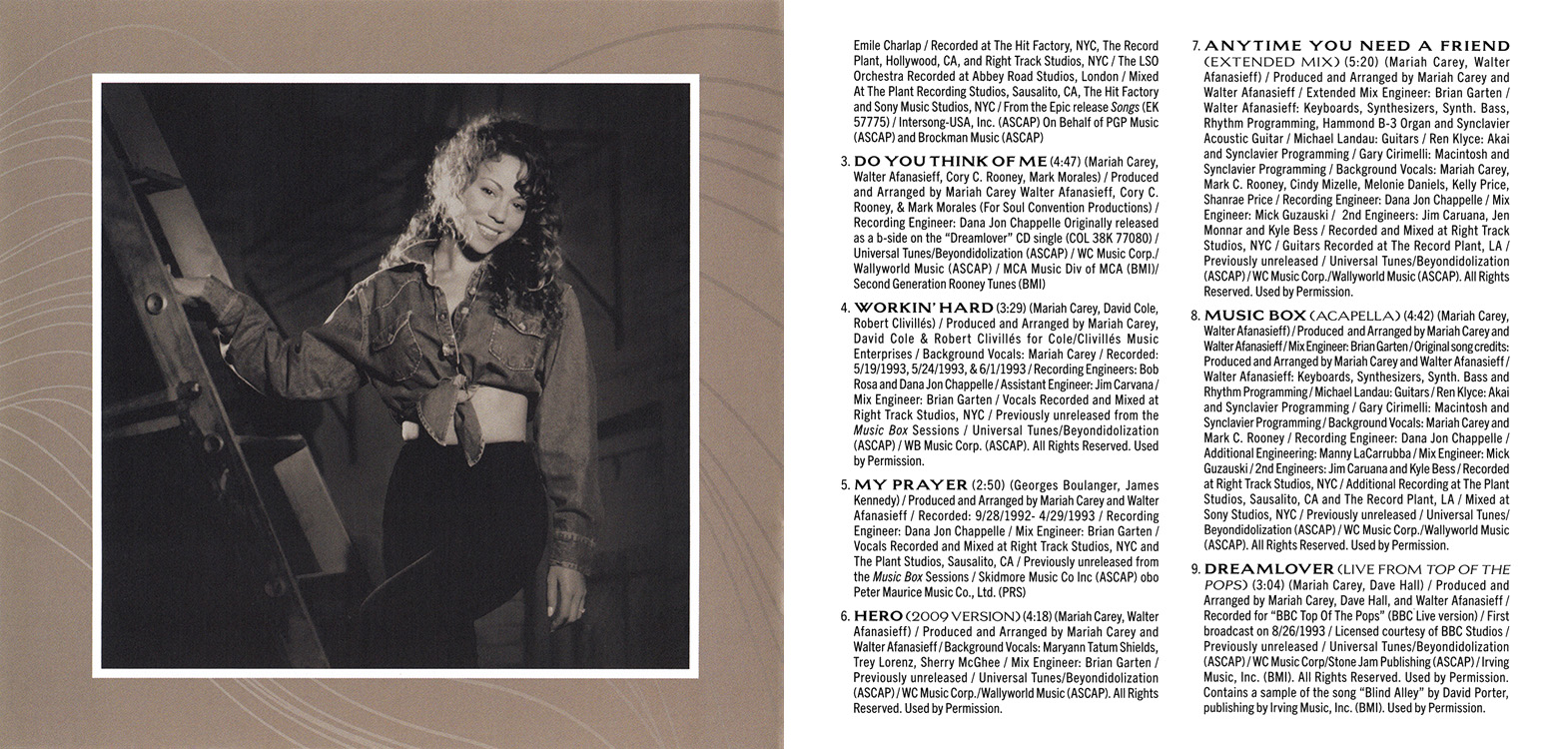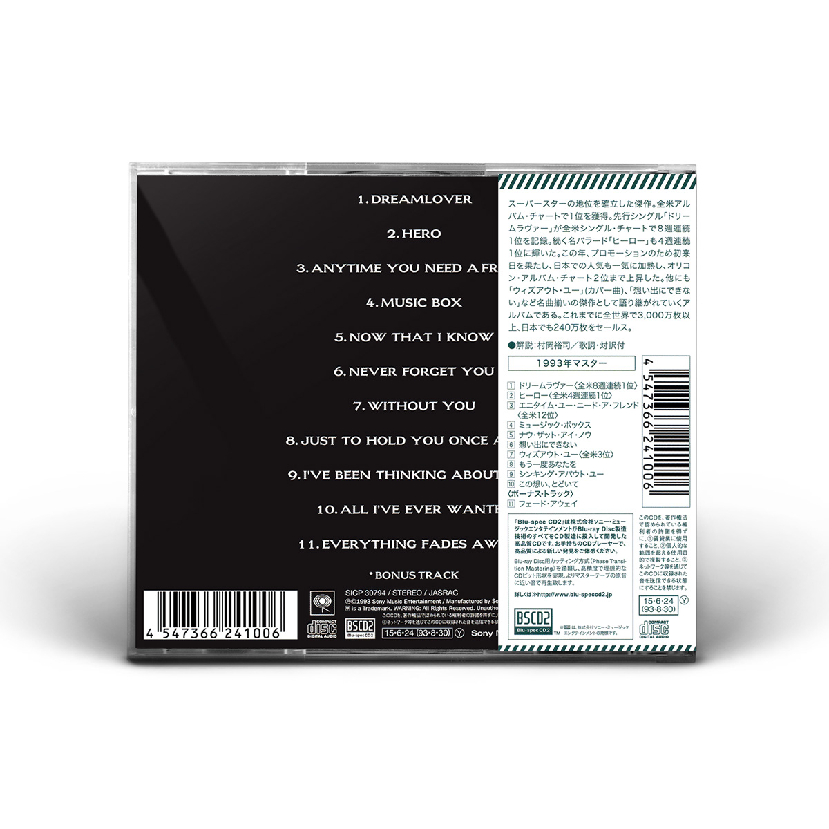 International editions of Music Box include the bonus track “Everything Fades Away,” composed by Mariah Carey and Walter Afanasieff. The album was later re-released in Spain and Latin America to include “Héroe,” the Spanish version of “Hero.”