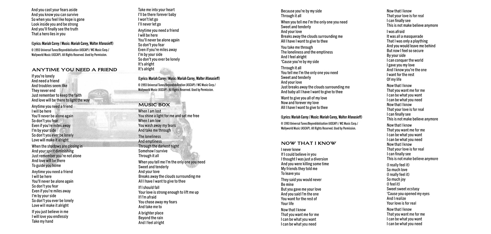 “Anytime You Need A Friend” was released as the fourth single on May 31, 1994, peaking at number twelve on the Billboard Hot 100 and remaining in the Top 40 for eighteen weeks. “I love the vocal arrangements in gospel music and I love background vocals, so it was a really fun song to do in the studio,” Mariah said about the song's gospel influence. “It sounds like a huge choir singing on it on the record, but it's mostly these three girls that have been working with me: the Price sisters and Melonie Daniels. It was a great experience to work with them and to do these gospel arrangements because they're really from the church and they're really really authentic — it's definitely one of my favorite songs on the album.”