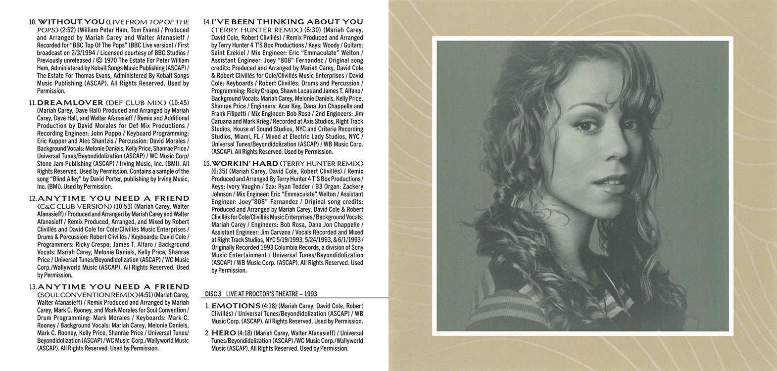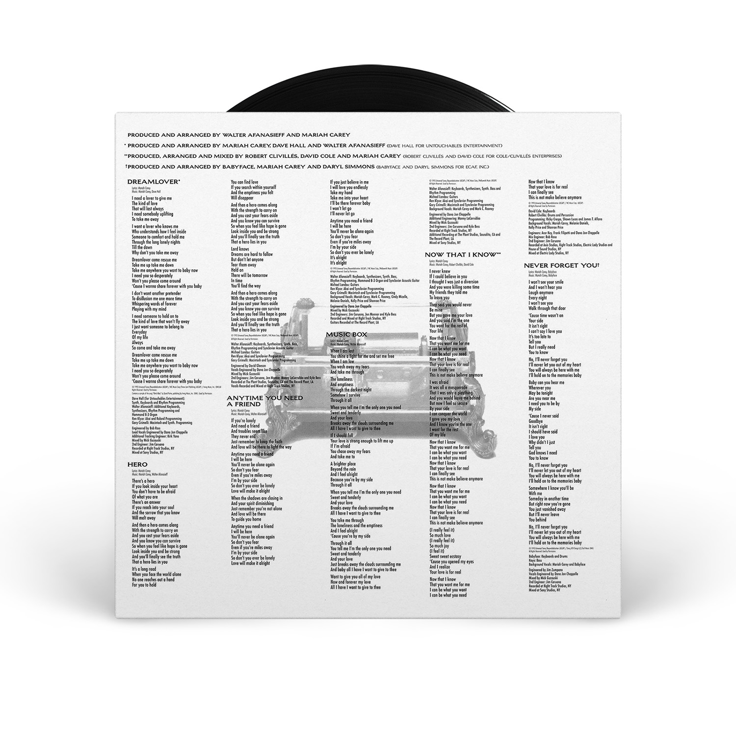 Mariah wrote most of the album with Walter Afanasieff and David Cole & Robert Clivillés. “Walter is my favorite person to work with because we really know each other very well musically,” Mariah explained. “He lives in San Francisco and I live in New York, so he would do a rough version of the track and send it to me and I would do all the vocals like that. I felt really free to do what I wanted on this album because I didn't have anyone over my shoulder the whole time. It was just like: ‘This is my album, I'm doing it this way.’ I felt like it was the next step for me to really be alone in the studio for most of the album. It really helped me get myself out there. It helped me to get my personality across, and get the emotions I was feeling at the time of each song out a bit more. We have this connection where I'll sing what I'm hearing and he'll start playing, and usually it's what I'm hearing in my head. Walter really tries to let me lead. He knows it's important to me to let the melodies I have develop.”