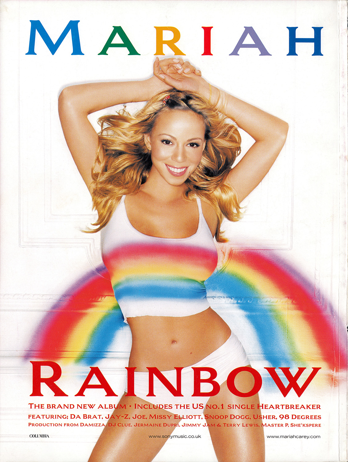 Rainbow saw Mariah working with Jermaine Dupri, She'kspere Briggs, DJ Clue and Damizza, among others. “I hope that people understand that this is the music that I love. I love all types of music and I've tried to integrate a lot of different things on this album,” she explained. “I co-produce all my own work. Co-producing is the only way I could incorporate all the styles I wanted to work with on this LP. Let's say there's another singer who's not a writer or a producer and sang with all the people I've worked with on the album, and worked with all the styles I have on the album — it would sound like it didn't fit. I know how to merge the sounds because the sounds are in me.”