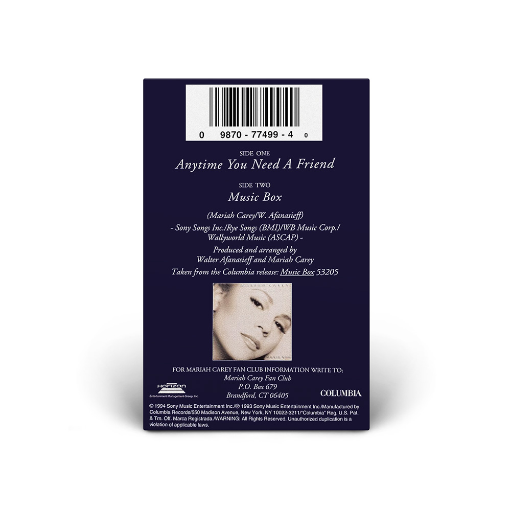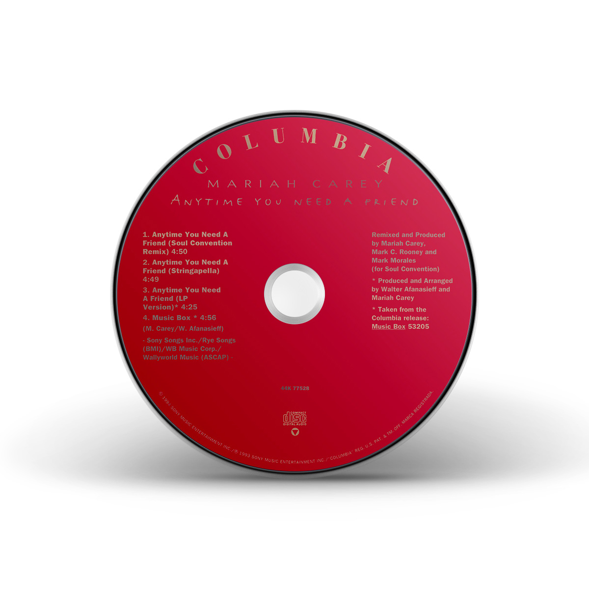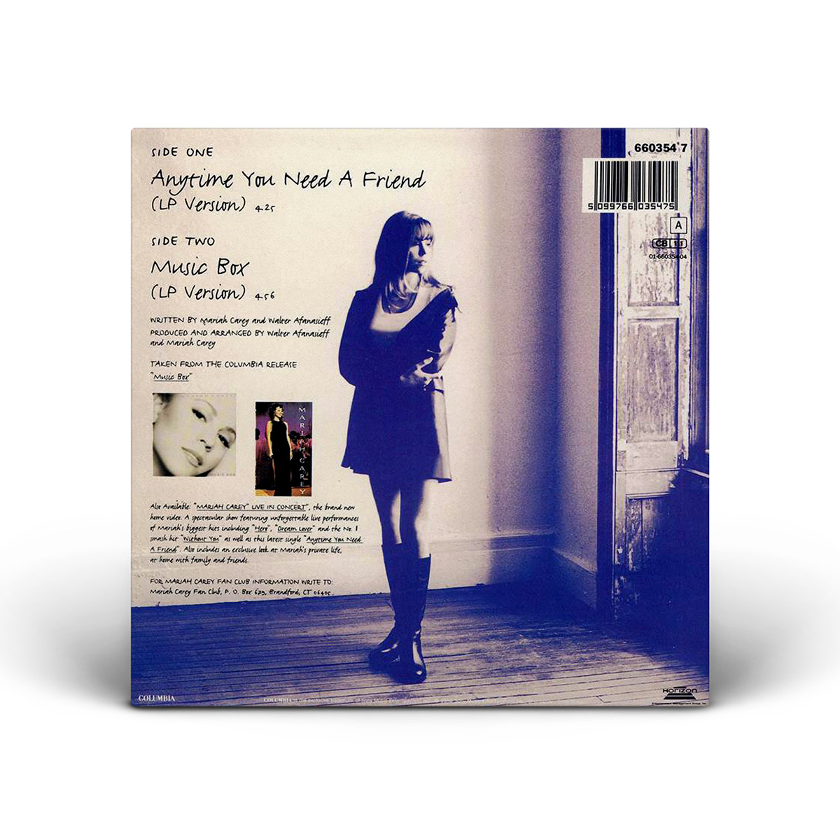 In the United States, the “Anytime You Need A Friend” Single was released on Cassette with two different covers, and includes the song “Music Box” as the B-side. The Cassette Maxi Single contains the Album Version of “Anytime You Need A Friend” and three remixes: C&C Extended Mix, C&C Radio Edit and Soul Convention Remix. There were two CD Maxi Singles available: CD 1 contains two remixes by Soul Convention (Soul Convention Remix and Stringapella), and the Album Version of “Anytime You Need A Friend” and “Music Box.” CD 2 includes four remixes by David Cole and Robert Clivillés: C&C Club Version, Ministry Of Sound Mix, Daves' Empty Pass and 7" Mix. “Anytime You Need A Friend” received a double 12" Vinyl release, including the album version of the song and four C&C remixes: All That And More Mix, Ministry Of Sound Mix, Boriqua Tribe Mix and C&C Dub.