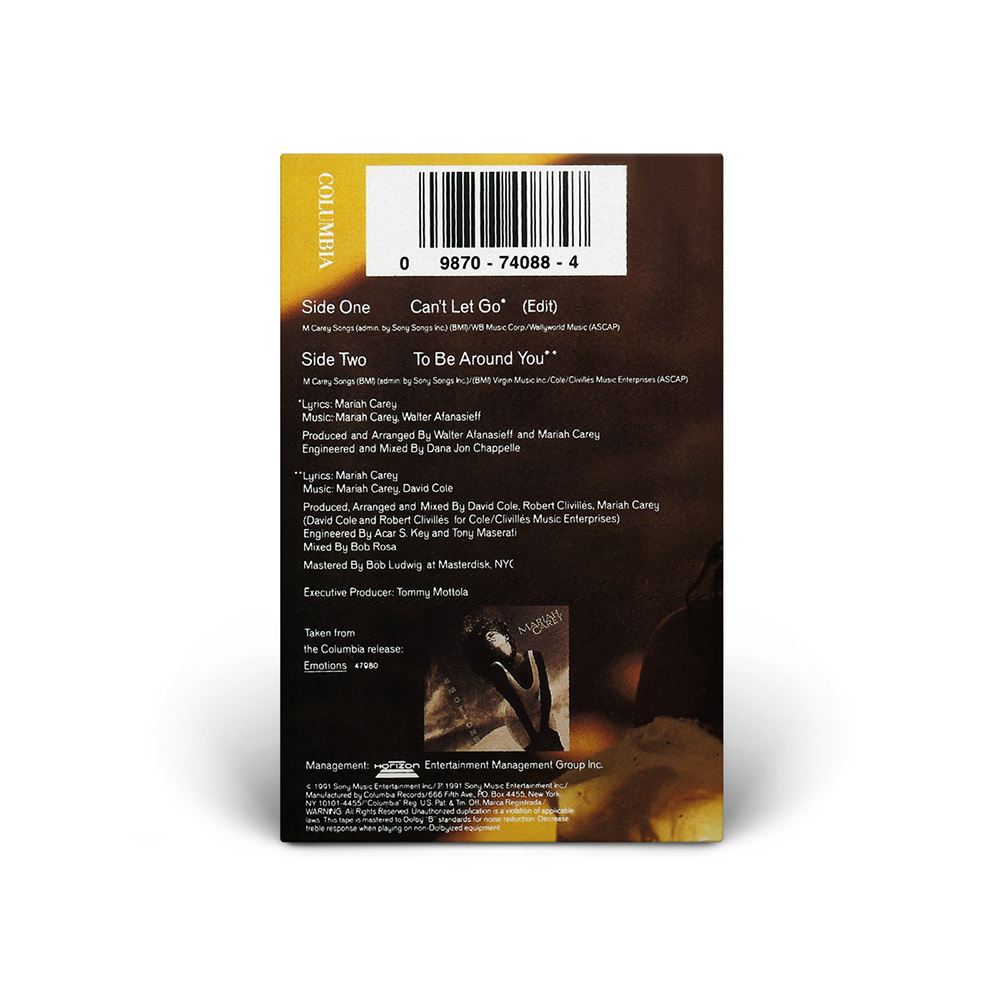 “Can't Let Go” was commercially released in the United Kingdom on December 2, 1991. CD 1 includes the Edit Version of “Can't Let Go” and two songs from the Emotions album: “To Be Around You” and “The Wind.” CD2 contains the Edit Version of “Can't Let Go” and two songs from Mariah's debut album: “I Don't Wanna Cry” and “All In Your Mind.” The Single, available on Cassette and 7" Vinyl, includes the Edit Version of “Can't Let Go” and “To Be Around You.”