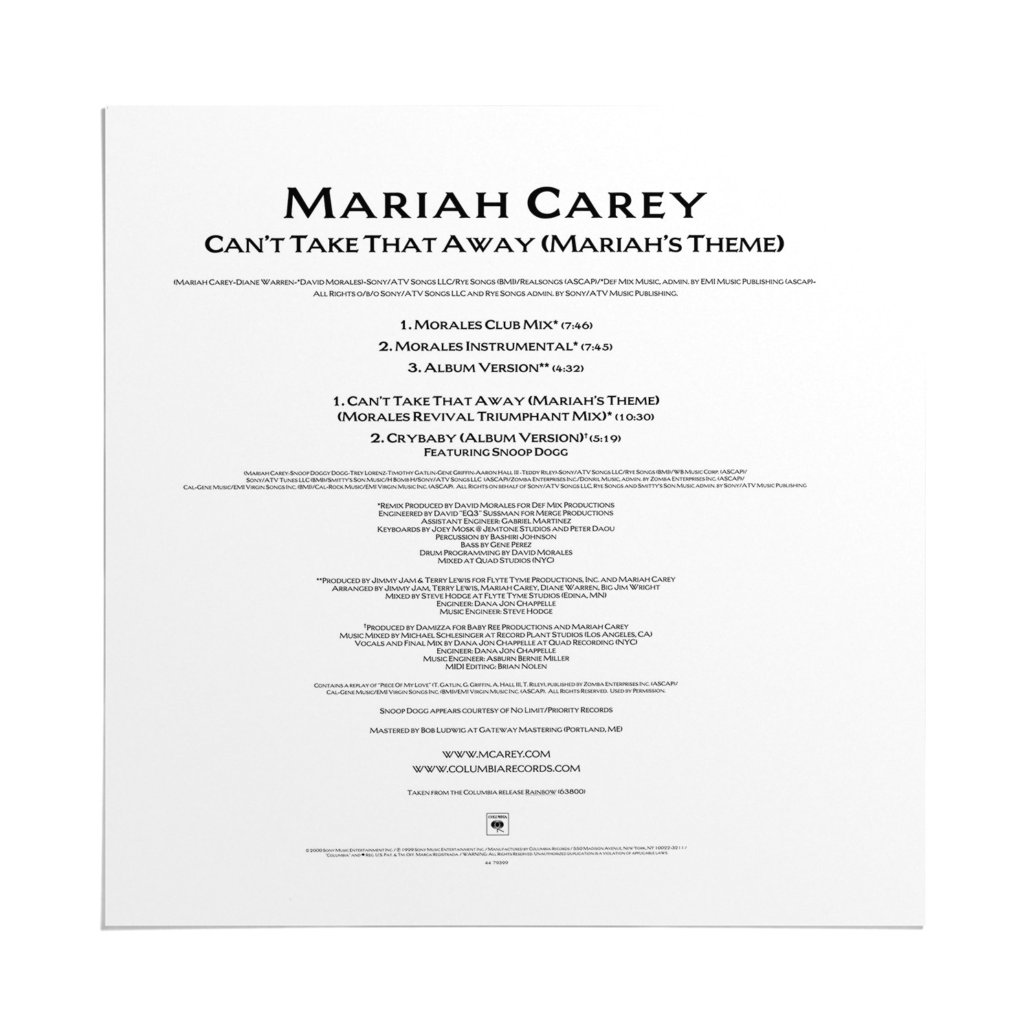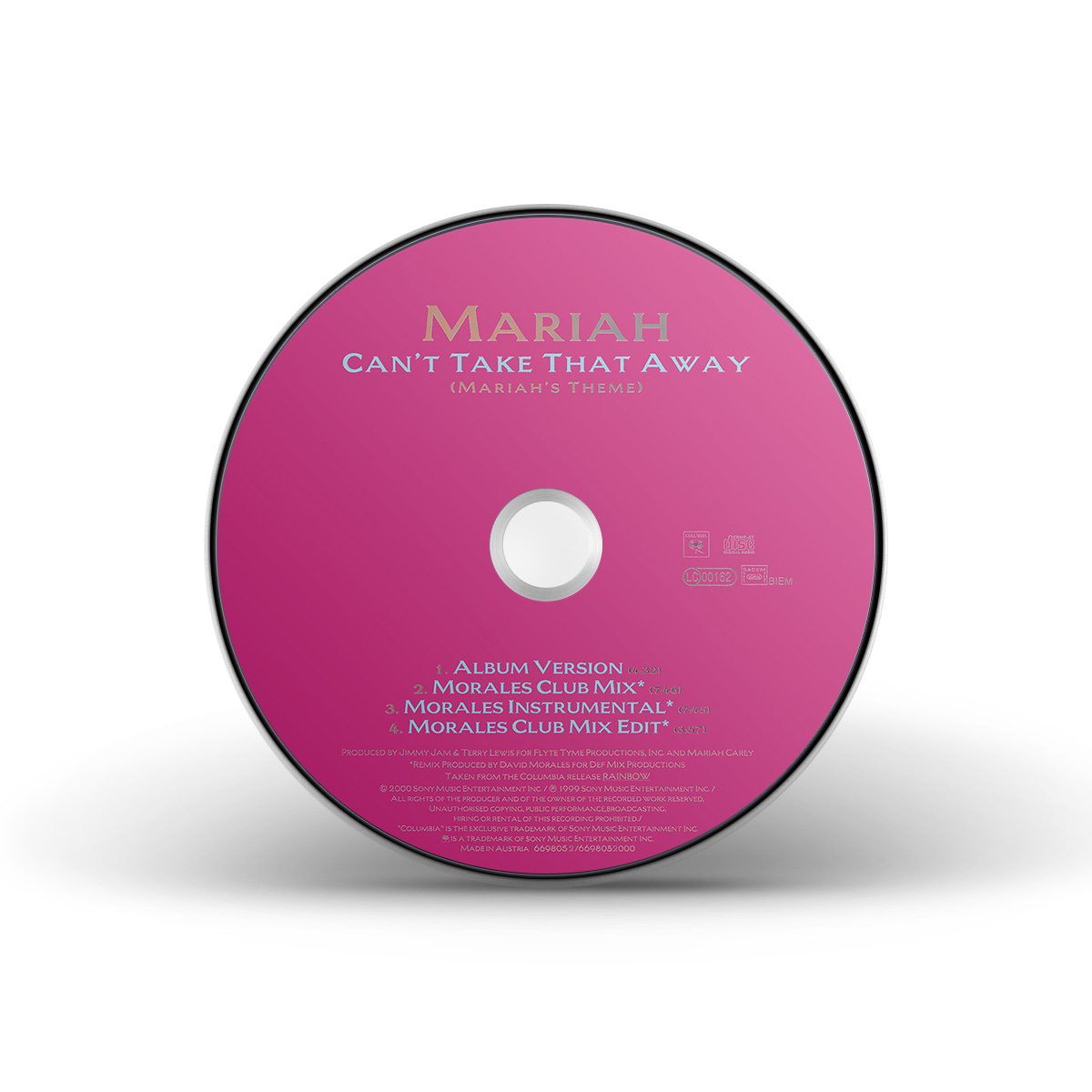 Released in Europe in late February 2001, the CD single includes the Radio Edit and the Morales Club Mix Edit of the song, while the CD Maxi single features three remixes by David Morales. “Can't Take That Away (Mariah's Theme)” was also released on 12" vinyl in Europe, including four Morales remixes as well as the album version of the song.