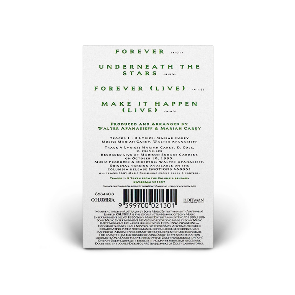 The Australian “Forever” Maxi Single, released on CD and cassette, includes the Album Version of “Forever” and “Underneath The Stars,” as well as the live versions of “Forever” from Mariah's Daydream tour in Tokyo and “Make It Happen” from Fantasy: Mariah Carey at Madison Square Garden.