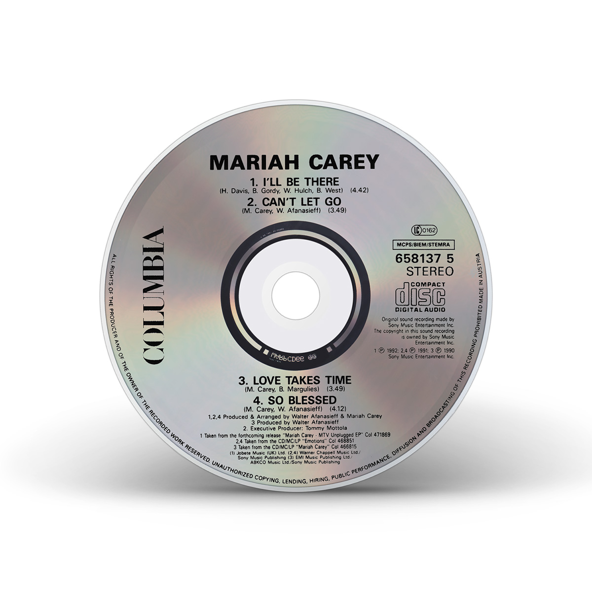 Two “I'll Be There” Maxi Singles were released in the UK on June 15, 1992. CD1 includes three additional ballads from Mariah's first two albums: “Love Takes Time” from Mariah Carey and “Can't Let Go” and “So Blessed” from Emotions. CD2 is limited edition picture CD which includes the live versions of “I'll Be There” and “Vision Of Love” from MTV Unplugged as well as “If It's Over,” from the Emotions album and “All In Your Mind,” from Mariah Carey. The “I'll Be There” single, available on 7" vinyl and cassette, included the song “So Blessed” as a bonus track.