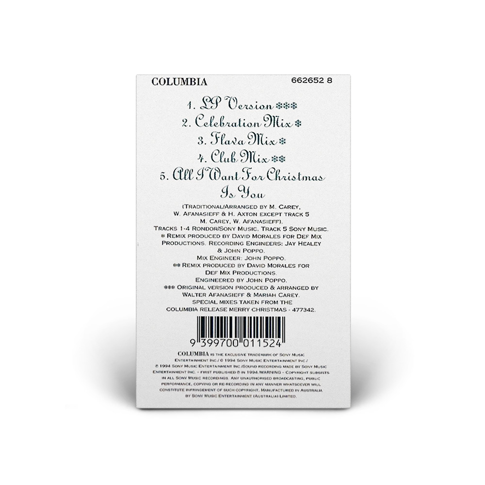 “Joy To The World” saw a commercial release in Australia. Available on CD and cassette, the Maxi Single includes the album version of “Joy To The World,” three remixes of the song produced by David Morales, and the album version of “All I Want For Christmas Is You.”