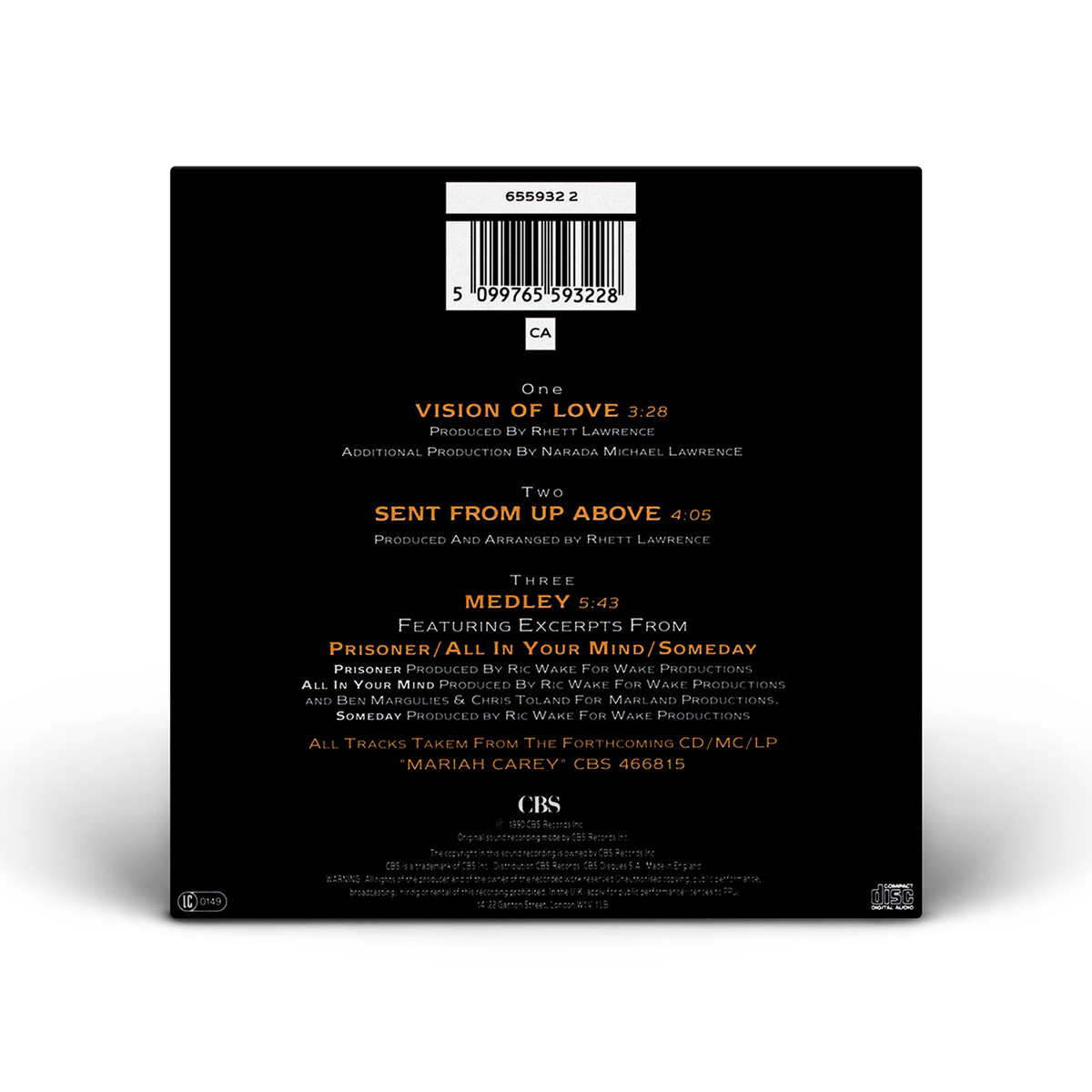 In Europe, the “Vision Of Love” Single was released on 3" CD and 7" Vinyl including the debut album medley. The Maxi Single — released on 3" CD and 12" Vinyl — also includes the song “Sent From Up Above.”
