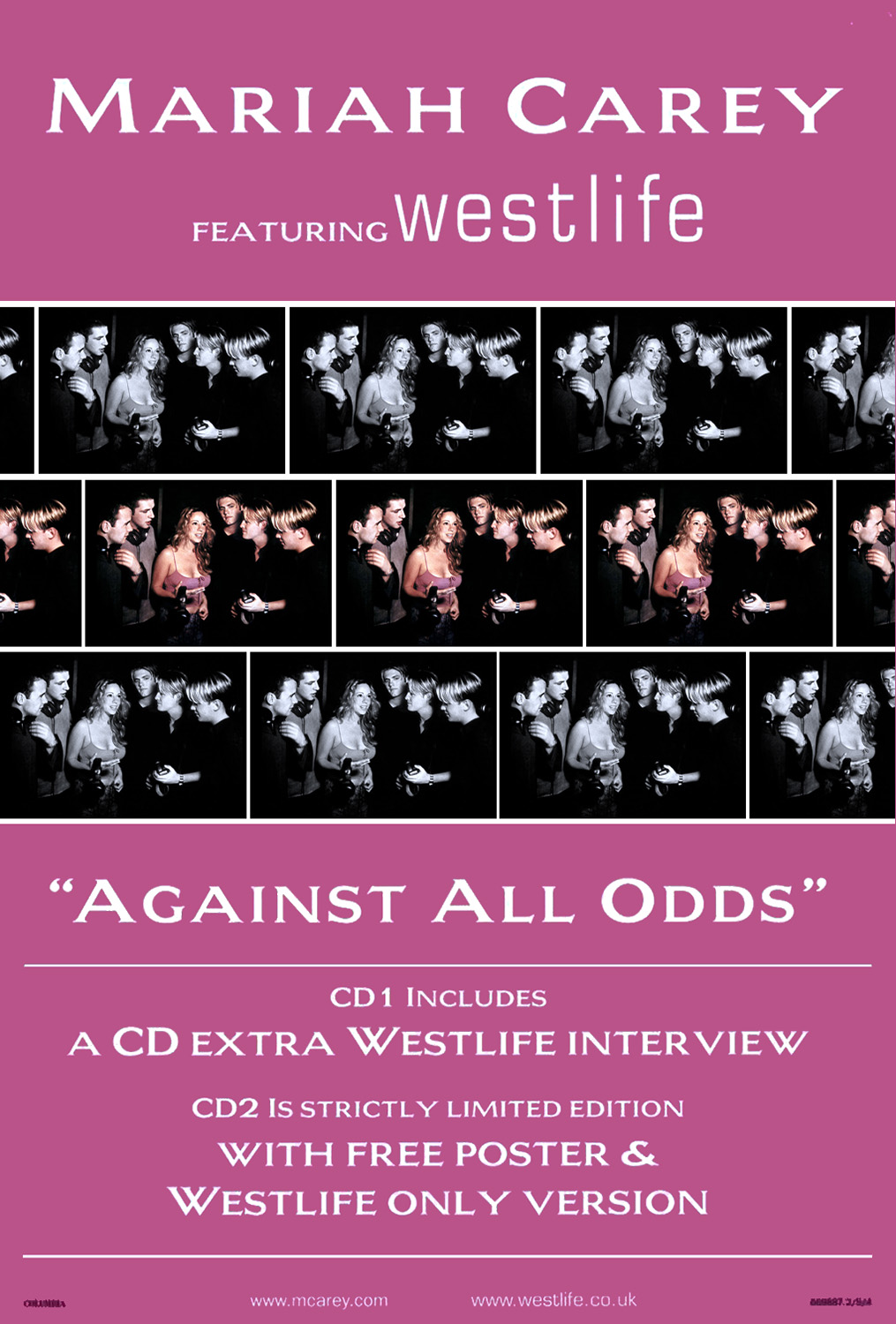 In the United Kingdom, only the duet version of “Against All Odds (Take A Look At Me Now)” saw a physical release. Both maxi singles were released with additional multimedia content and include the duet with Westlife and two bonus tracks: CD 1 includes the Pound Boys Main Mix of Mariah's cover of the song, the Mariah-only version of the duet, and a video interview with Westlife; CD 2 includes the Pound Boys Deep Dub of Mariah's version of “Against All Odds (Take A Look At Me Now),” the Westlife-only version of the duet and the music video. A Cassette Single was also released, including their duet and the Pound Boys Radio Edit of Mariah's cover of the song.