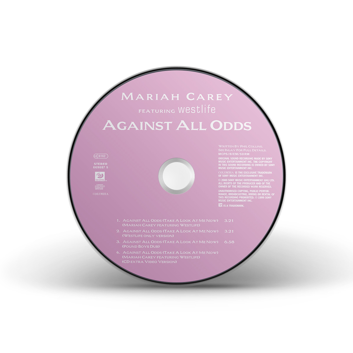 Mariah's cover of “Against All Odds (Take A Look At Me Now)” was released in Europe on May 29, 2000. The CD single features “Crybaby” as the B-side, while the Maxi Single also includes the StarGate Radio Edit of “Thank God I Found You” and the Morales Club Mix Edit of “Can't Take That Away (Mariah's Theme).” The duet version of “Against All Odds (Take A Look At Me Now)” with Westlife was later released on CD single, including the Rainbow album version of the song. The duet Maxi Single has an extra track: the Pound Boys Main Mix of the solo version of the song.