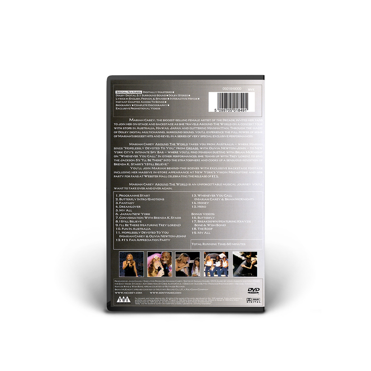 Around The World features footage from Mariah's 1998 Butterfly Tour, which visited Japan, Taiwan, Australia and Hawaii, and saw Mariah performing some of her biggest hits including “Fantasy,” “Hero,” “My All” and “I'll Be There” — including a very special performance of the song “Hopelessly Devoted To You,” from the Grease movie soundtrack, with Olivia Newton-John.