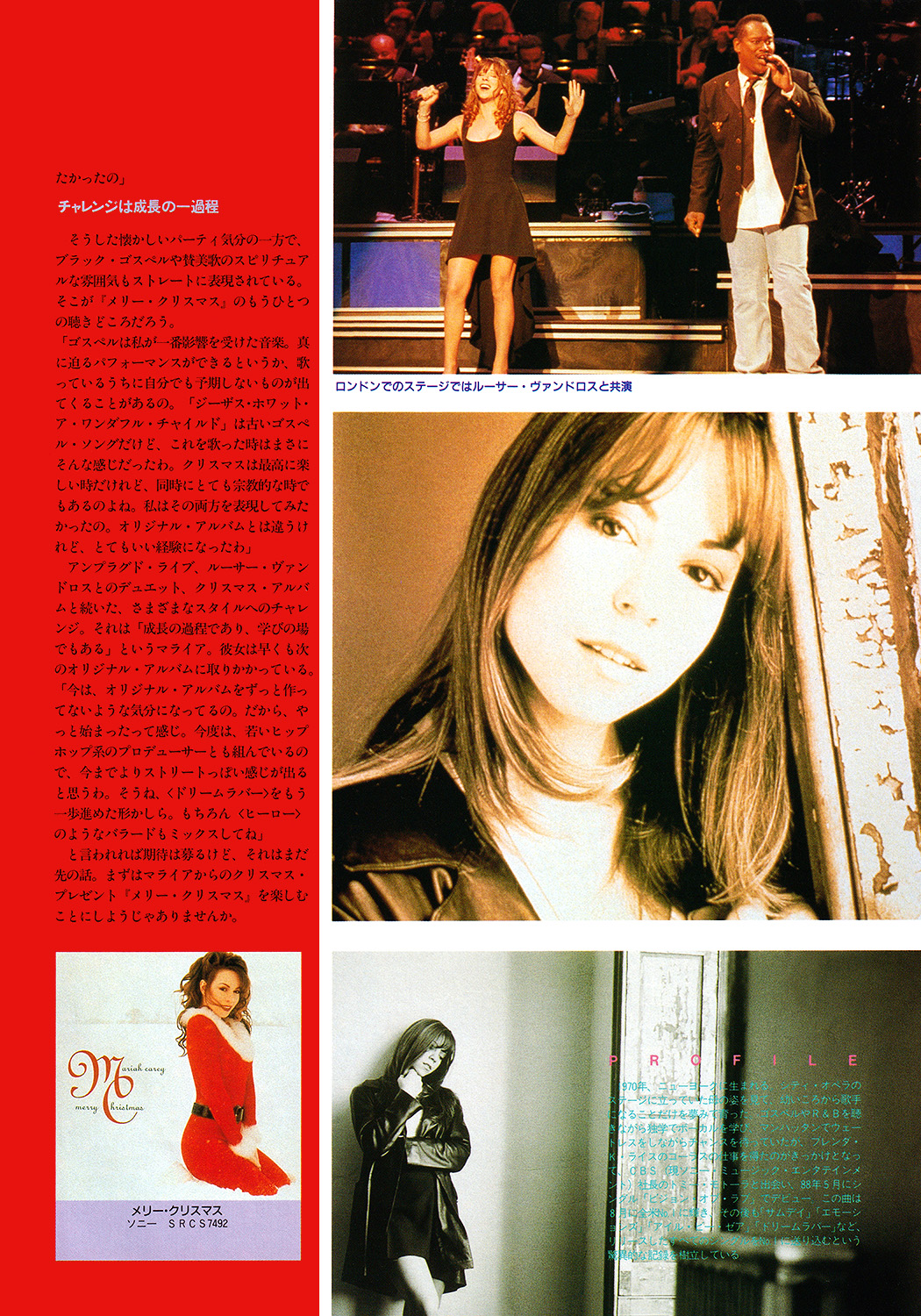 アンプラグド・ライブ、ルーサー・ヴァンドロスとのデュエット、クリスマス・アルバムと続いた、さまざまなスタイルへのチャレンジ。それは「成長の過程であり、学びの場でもある」というマライア。彼女は早くも次のオリジナル・アルバムに取りかかっている。「今は、オリジナル・アルバムをずっと作ってないような気分になってるの。だから、やっと始まったって感じ。今度は、若いヒップホップ系のプロデューサーとも組んでいるので、今までよりストリートっぽい感じが出ると思うわ。そうね、<ドリームラバー>をもう一歩進めた形かしら。もちろん<ヒーロー>のようなバラードもミックスしてね」