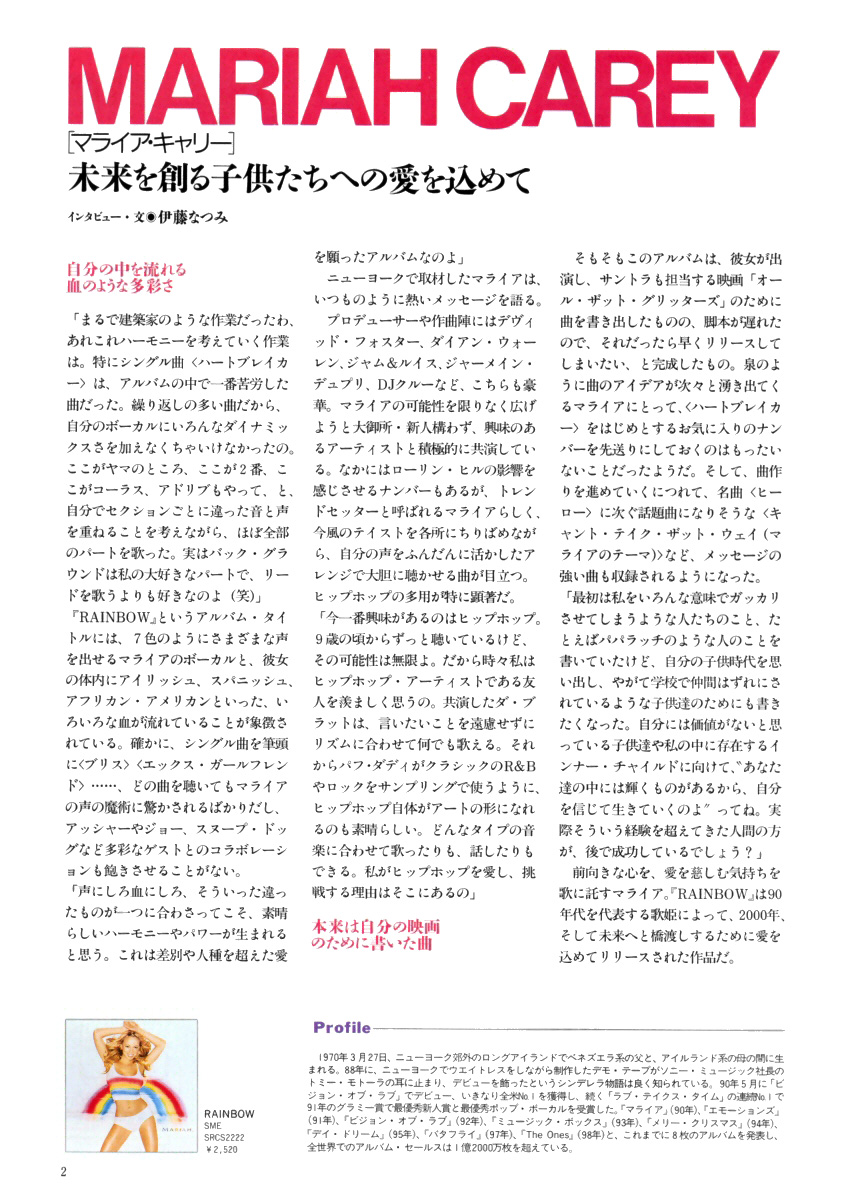 前向きな心を、愛を意しむ気持ちを数に託すマライア。「RAINBOW」は90年代を代表する歌姫によって、2000年、そして未来へと橋渡しするために愛を込めてリリースされた作品だ。