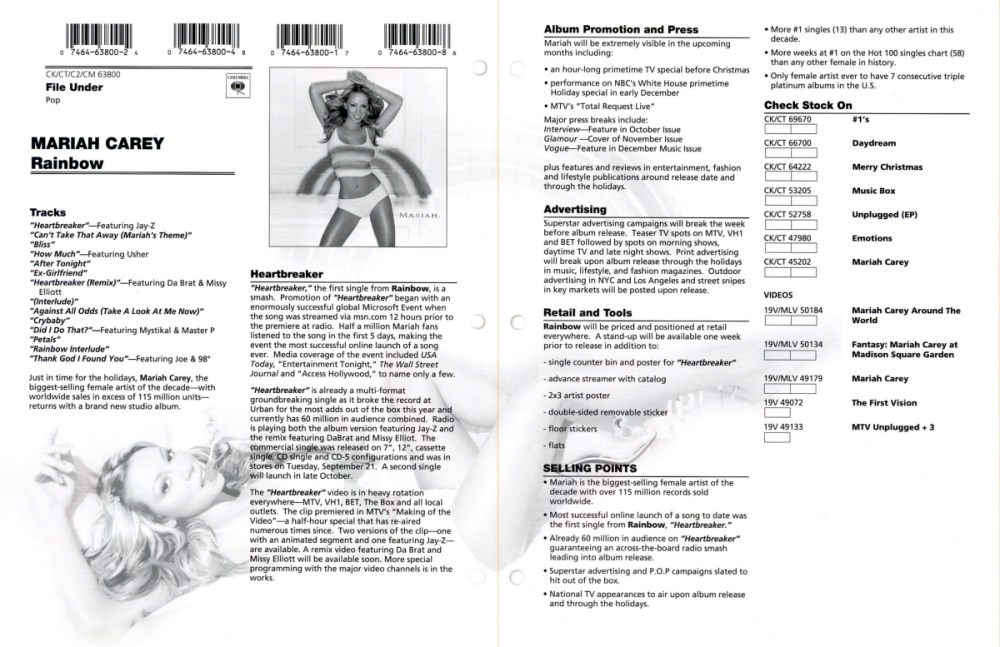 Rainbow saw Mariah working with Jermaine Dupri, She'kspere Briggs, DJ Clue and Damizza, among others. “I hope that people understand that this is the music that I love. I love all types of music and I've tried to integrate a lot of different things on this album,” she explained. “I co-produce all my own work. Co-producing is the only way I could incorporate all the styles I wanted to work with on this LP. Let's say there's another singer who's not a writer or a producer and sang with all the people I've worked with on the album, and worked with all the styles I have on the album — it would sound like it didn't fit. I know how to merge the sounds because the sounds are in me.”