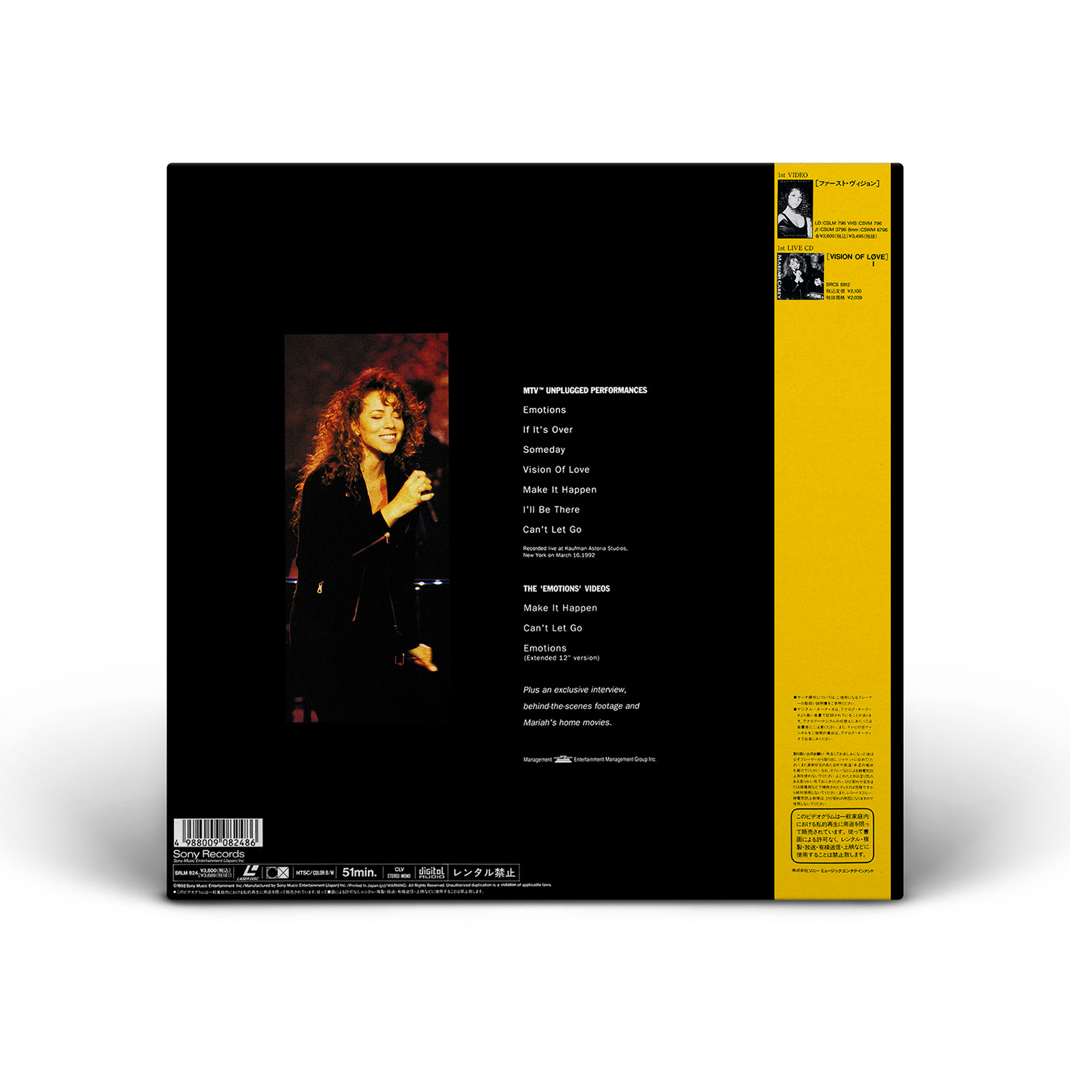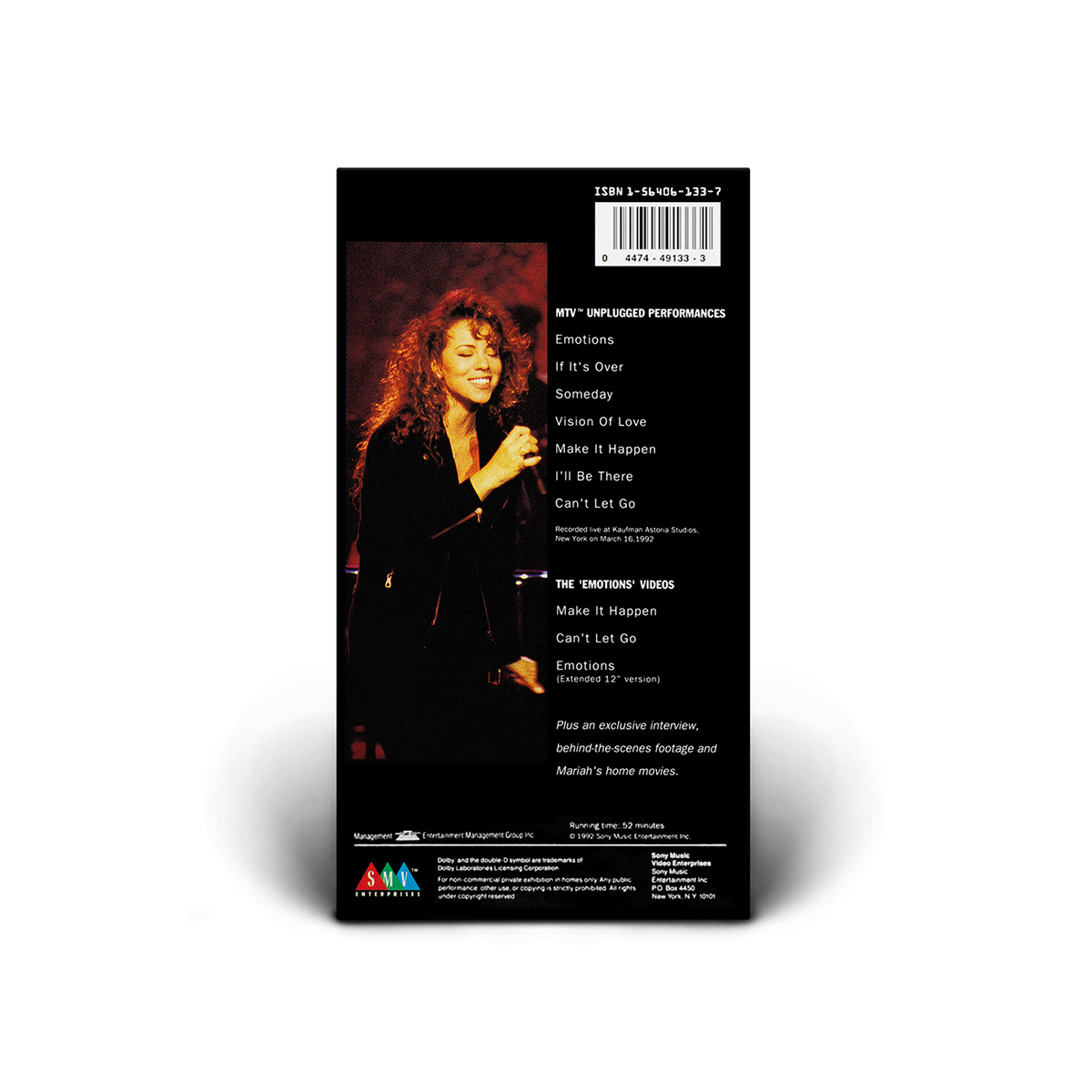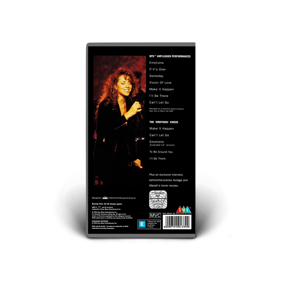 MTV Unplugged was also released on VHS on June 2, 1992, under the title MTV Unplugged +3. The home video includes the whole concert, three music videos (“Make It Happen,” “Can't Let Go” and the 12" Club Mix of “Emotions”), an exclusive interview, behind-the-scenes footage and Mariah's home movies. MTV Unplugged +3 topped Billboard's Video Chart and was certified Platinum by the Recording Industry Association Of America on November 1, 1996. The home video was released on DVD on September 12, 2006, and digitally on December 7, 2021.
