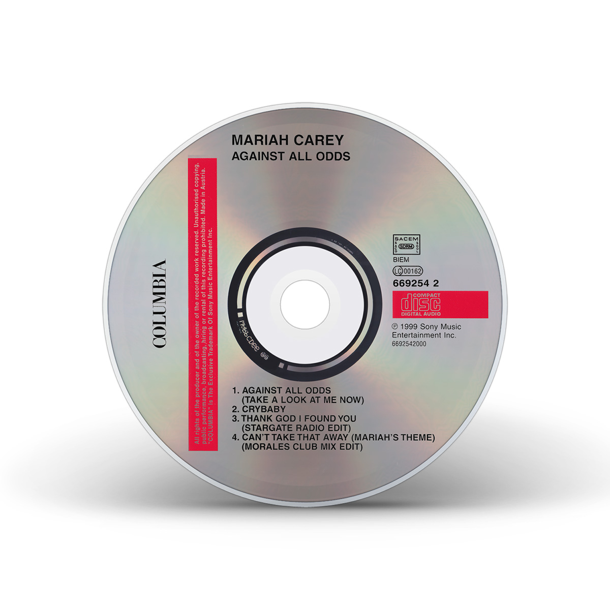 The original “Against All Odds (Take A Look At Me Now)” European CD single features “Crybaby” as the B-side, while the Maxi Single also includes the StarGate Radio Edit of “Thank God I Found You” and the Morales Club Mix Edit of “Can't Take That Away (Mariah's Theme).”
