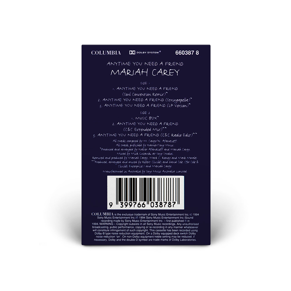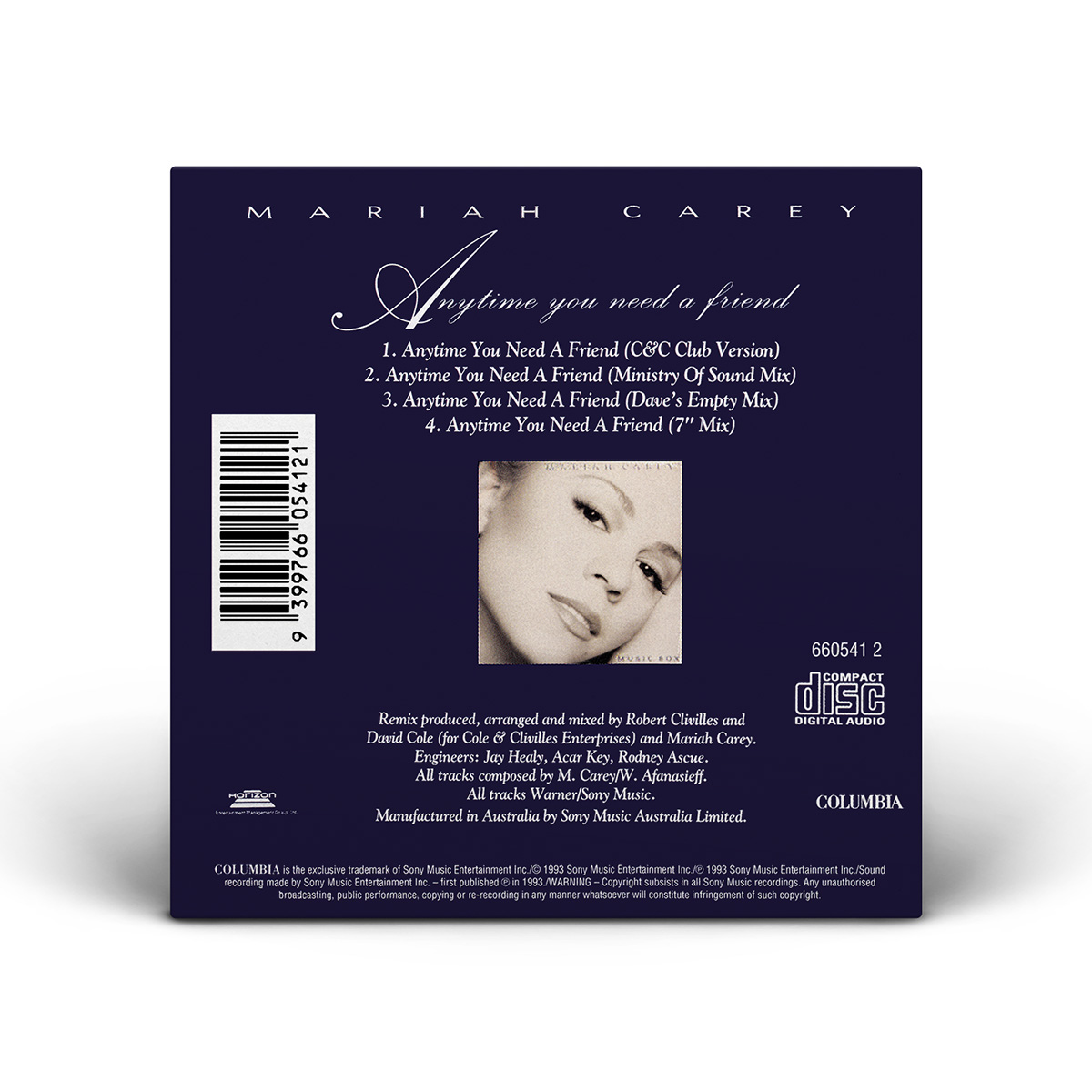 In Australia, “Anytime You Need A Friend” was released on CD and cassette, both including the Album Version, the Celebratory Mix and the Make It Last Remix Edit of “Anytime You Need A Friend” as well as the “Heartbreaker” remix with Da Brat & Missy Elliott.