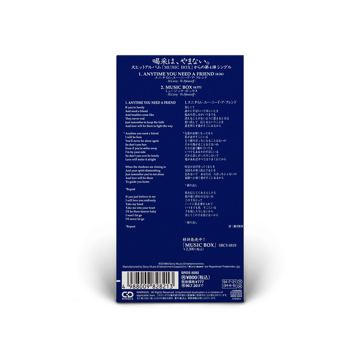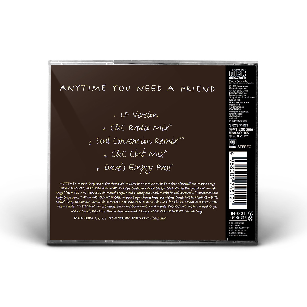 Sony Music Japan issued two “Anytime You Need A Friend” CDs. The 3" CD Single, released on July 21, 1994, includes “Music Box” as the B-side. A 5" CD Maxi Single became available on August 21, containing five versions of “Anytime You Need A Friend” (Album Version, C&C Radio Mix, Soul Convention Remix, C&C Club Mix and Dave's Empty Pass).