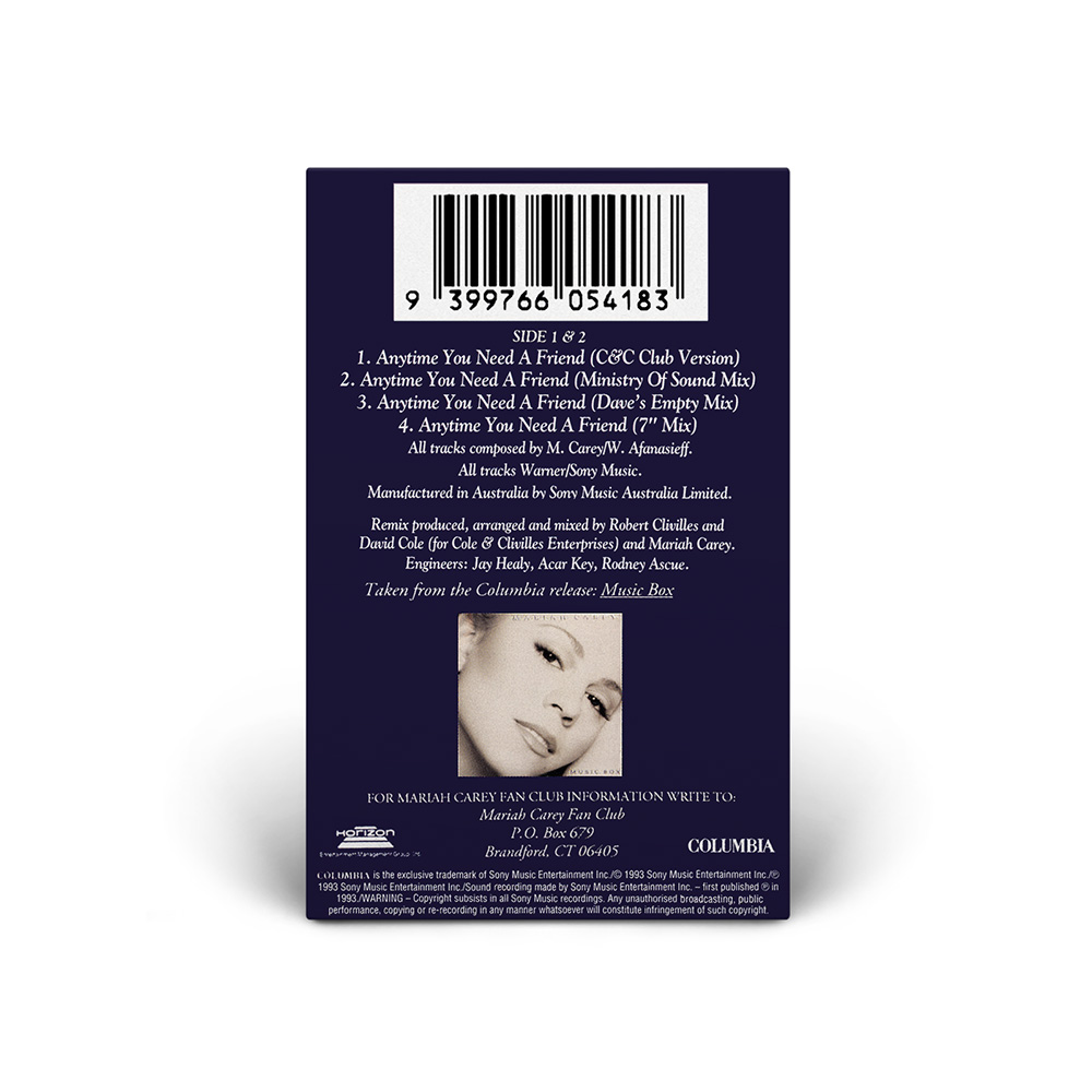 In the United States, the “Anytime You Need A Friend” Single was released on Cassette with two different covers, and includes the song “Music Box” as the B-side. The Cassette Maxi Single contains the Album Version of “Anytime You Need A Friend” and three remixes: C&C Extended Mix, C&C Radio Edit and Soul Convention Remix. There were two CD Maxi Singles available: CD 1 contains two remixes by Soul Convention (Soul Convention Remix and Stringapella), and the Album Version of “Anytime You Need A Friend” and “Music Box.” CD 2 includes four remixes by David Cole and Robert Clivillés: C&C Club Version, Ministry Of Sound Mix, Daves' Empty Pass and 7" Mix. “Anytime You Need A Friend” received a double 12" Vinyl release, including the album version of the song and four C&C remixes: All That And More Mix, Ministry Of Sound Mix, Boriqua Tribe Mix and C&C Dub.