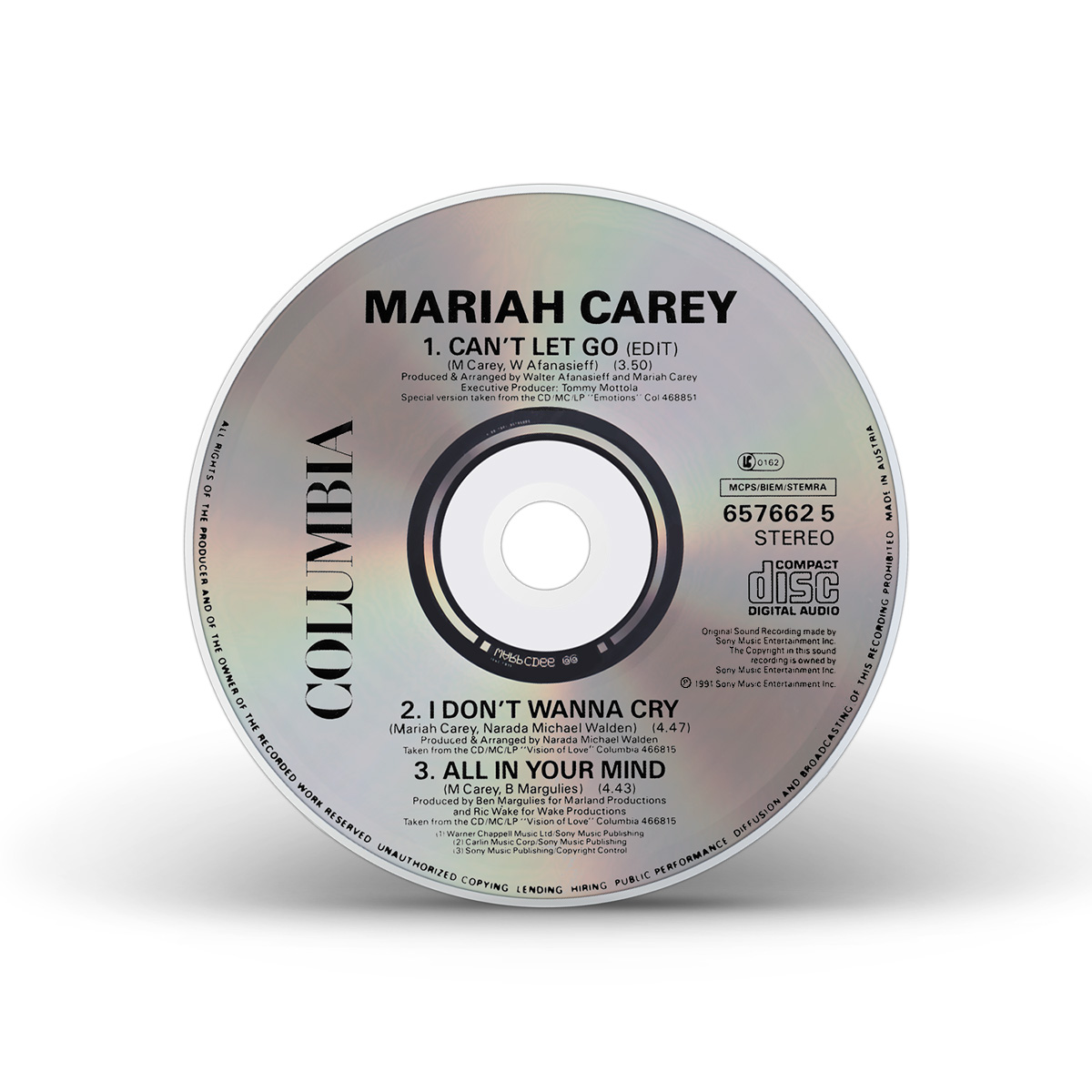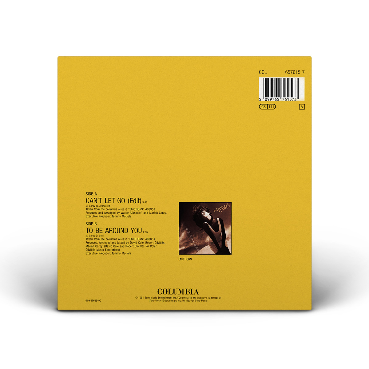 “Can't Let Go” was commercially released in the United Kingdom on December 2, 1991. CD 1 includes the Edit Version of “Can't Let Go” and two songs from the Emotions album: “To Be Around You” and “The Wind.” CD2 contains the Edit Version of “Can't Let Go” and two songs from Mariah's debut album: “I Don't Wanna Cry” and “All In Your Mind.” The Single, available on Cassette and 7" Vinyl, includes the Edit Version of “Can't Let Go” and “To Be Around You.”
