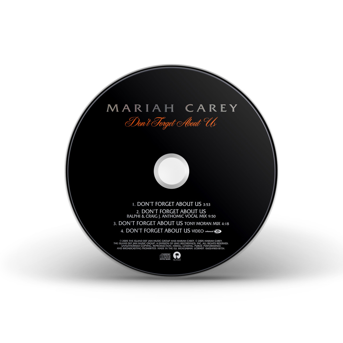 The only physical release for “Don't Forget About Us” in the United States was a double 12" Vinyl including four dance remixes by Tony Moran, Quentin Harris and Ralphi Rosario, which became available on December 12, 2005.