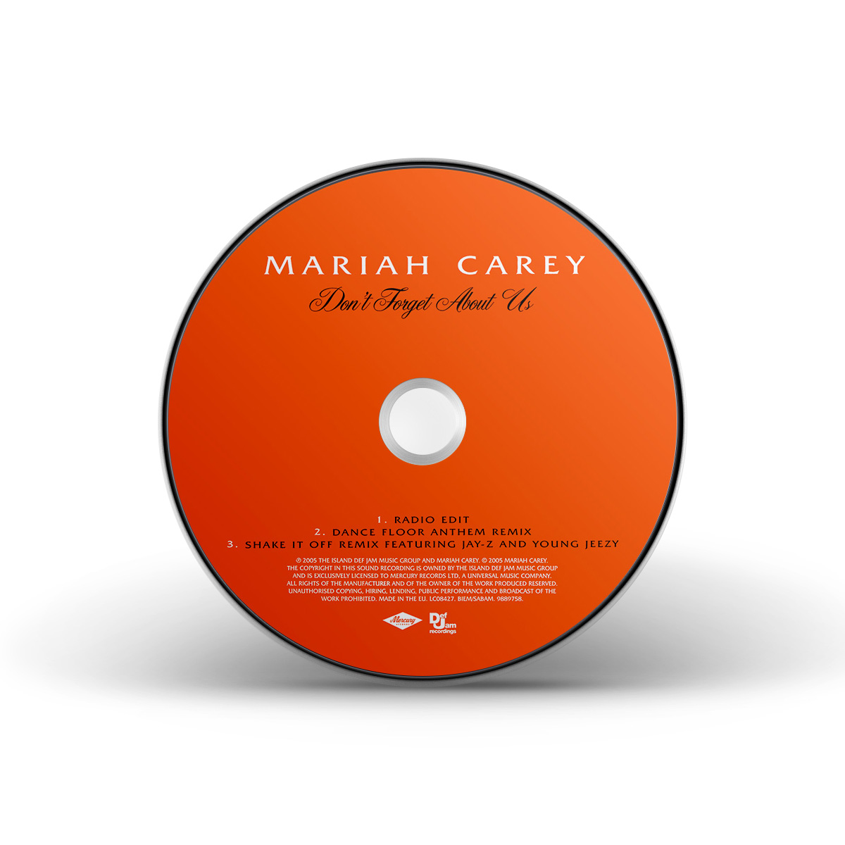 In Europe, the “Don't Forget About Us” CD Single includes the Album Version and the Remix featuring Juelz Santana and Bone Thugs-N-Harmony, while the CD Maxi Single includes the Ralphi Rosario & Craig J. Anthomic Vocal Mix and the Tony Moran Mix and the as well as the song's music video.