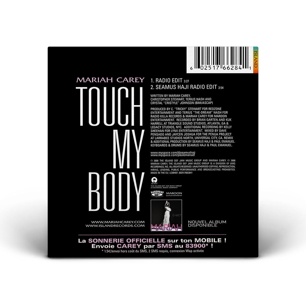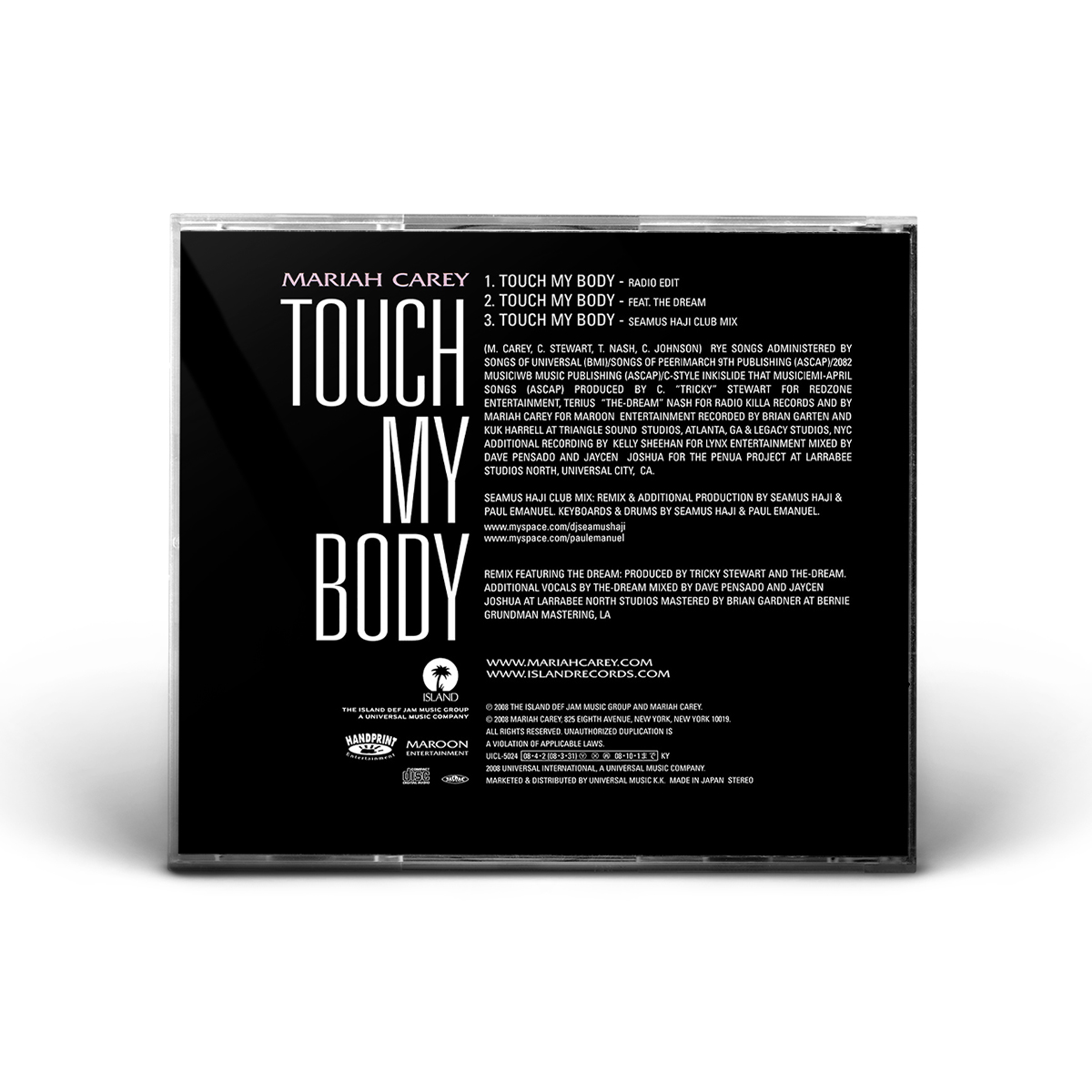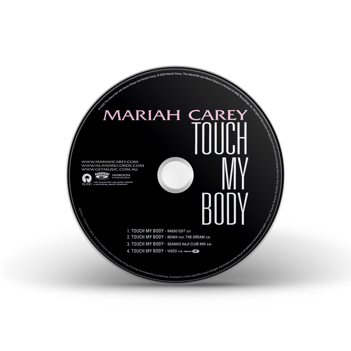 The European “Touch My Body” CD Single features the Radio Edit and the Seamus Haji Radio Edit of the song, while the Maxi Single — an enhanced CD — includes the Radio Edit, the Remix featuring The-Dream, the Seamus Haji Club Mix and the “Touch My Body” music video.