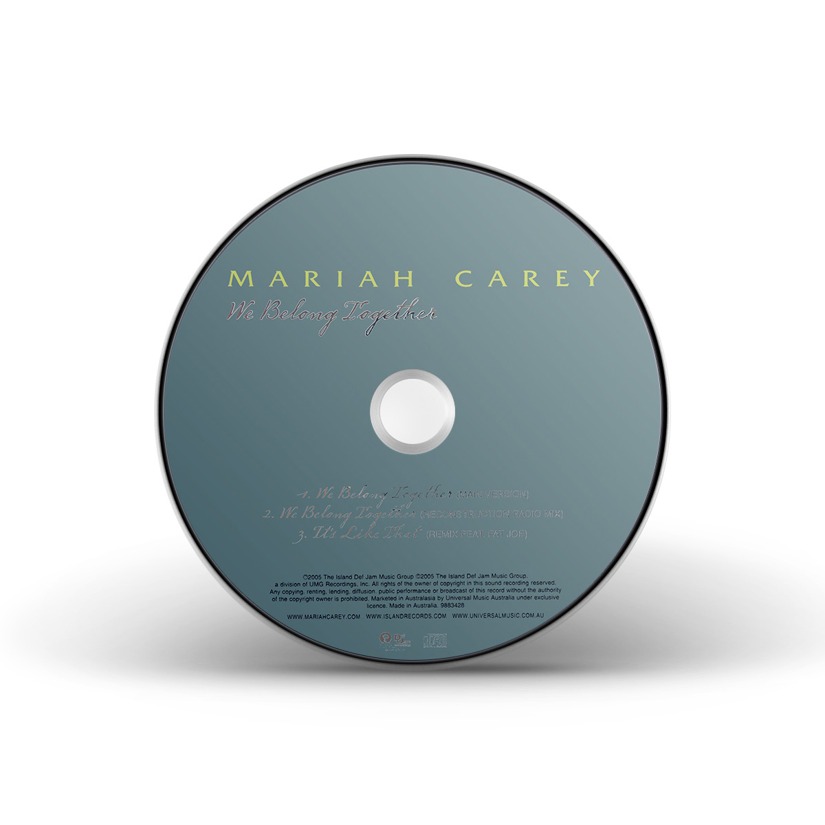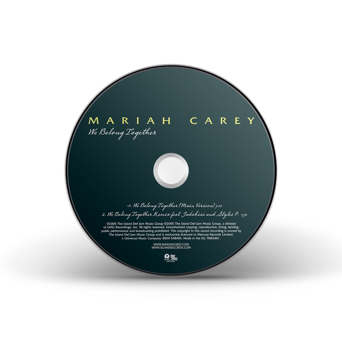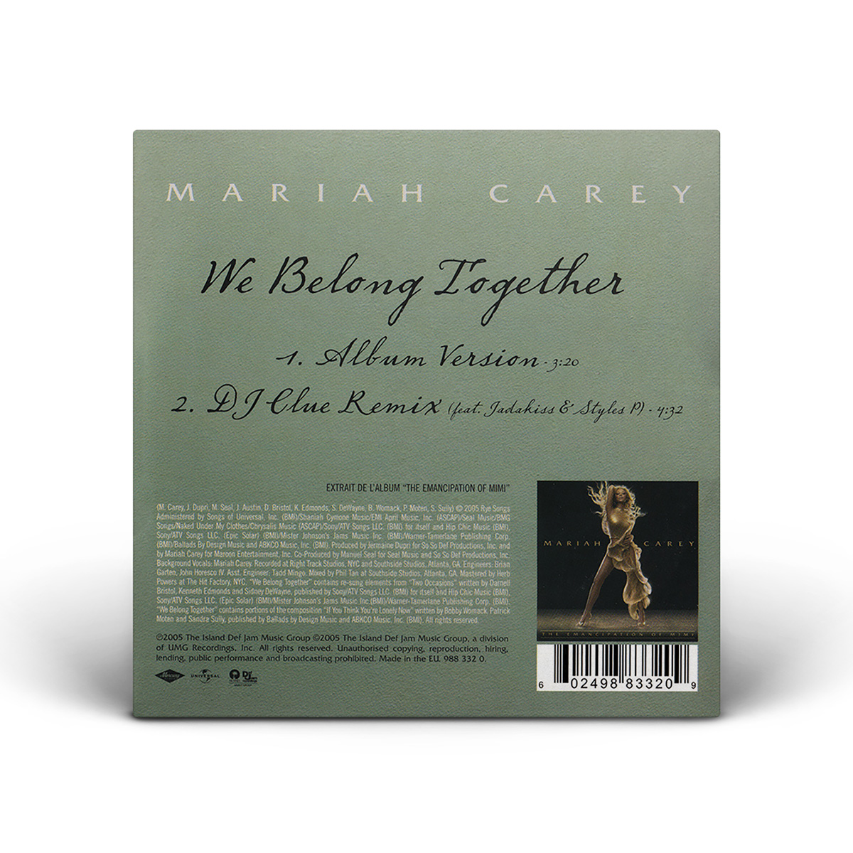 Released on June 26, 2005, the European “We Belong Together” CD Single was issued in cardboard sleeve including the Album Version and the DJ Clue Remix of the song. The Maxi Single was as Enhanced CD including the song's Album Version and the Reconstruction Radio Mix; the Scott Storch Remix of “It's Like That,” and the “We Belong Together” music video.