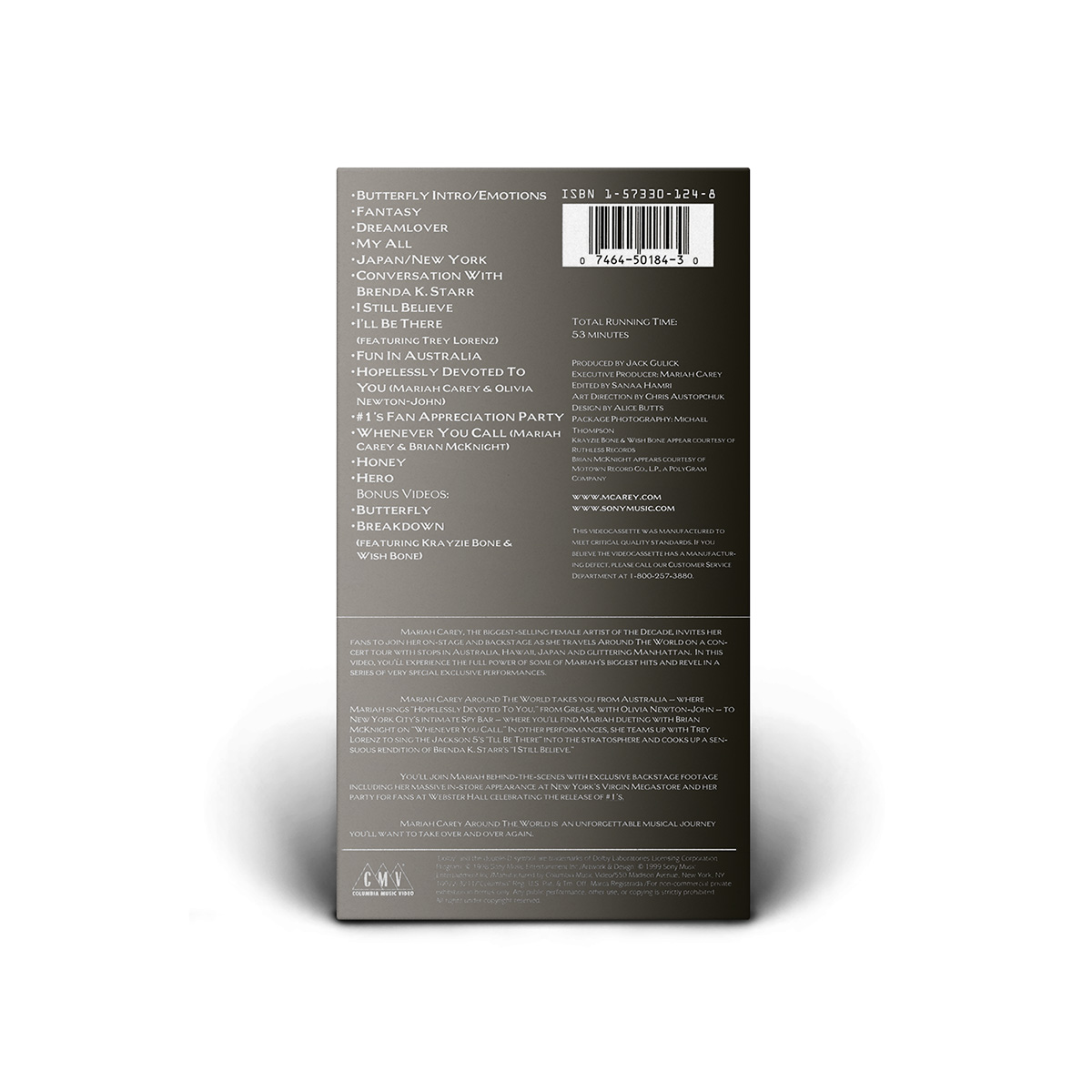 The home video also includes two performances at New York's intimate Spy Bar: “I Still Believe” and “Whenever You Call,” with Brian McKnight; as well as backstage footage from Mariah's massive in-store appearance at New York's Virgin Megastore and her party for fans at Webster Hall celebrating the release of #1's.
